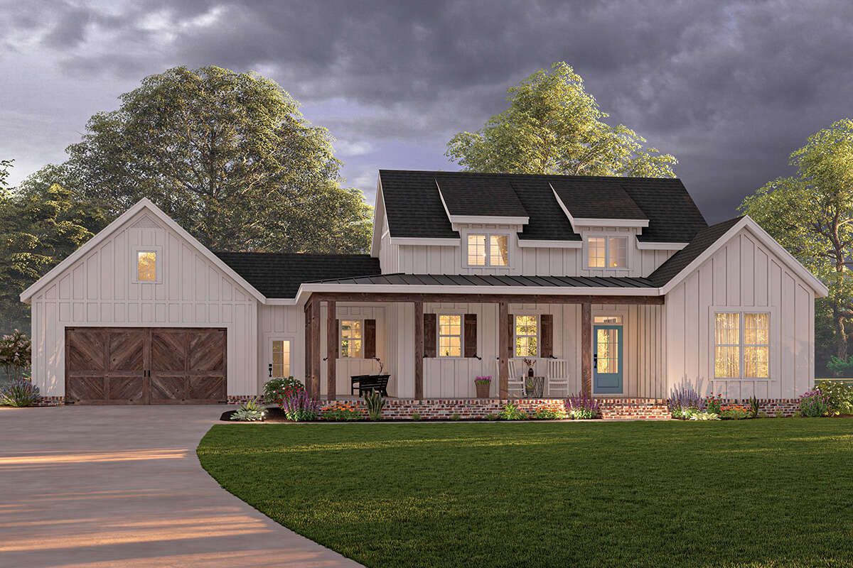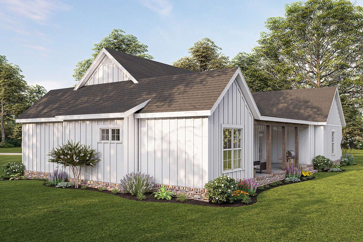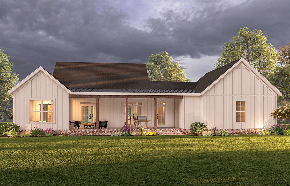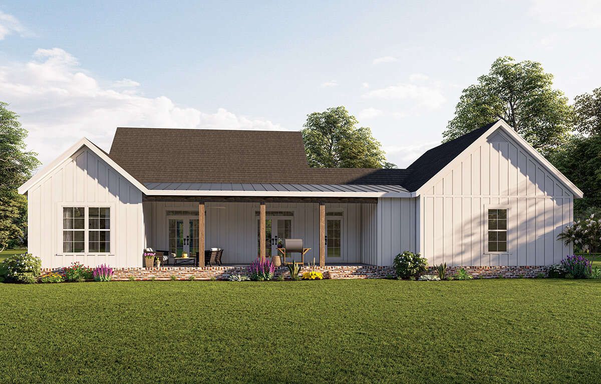 This modern farmhouse plan delivers an impressive combination of style, comfort, and efficiency. Its inviting porches, open living areas, and smart layout make it an excellent choice for homeowners seeking a well-designed and practical single-story home.