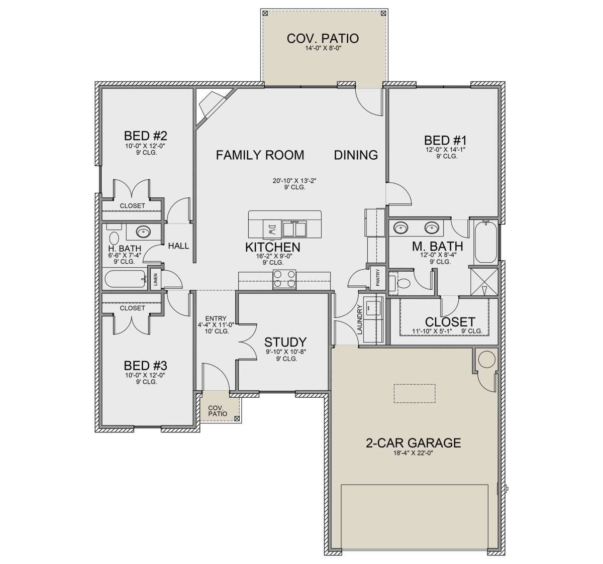 The plan includes two full bathrooms. The primary bathroom is connected to the owner’s suite, while the secondary bathroom is centrally located to serve the additional bedrooms and common areas. This layout supports smooth daily routines and offers convenience for both residents and visitors.