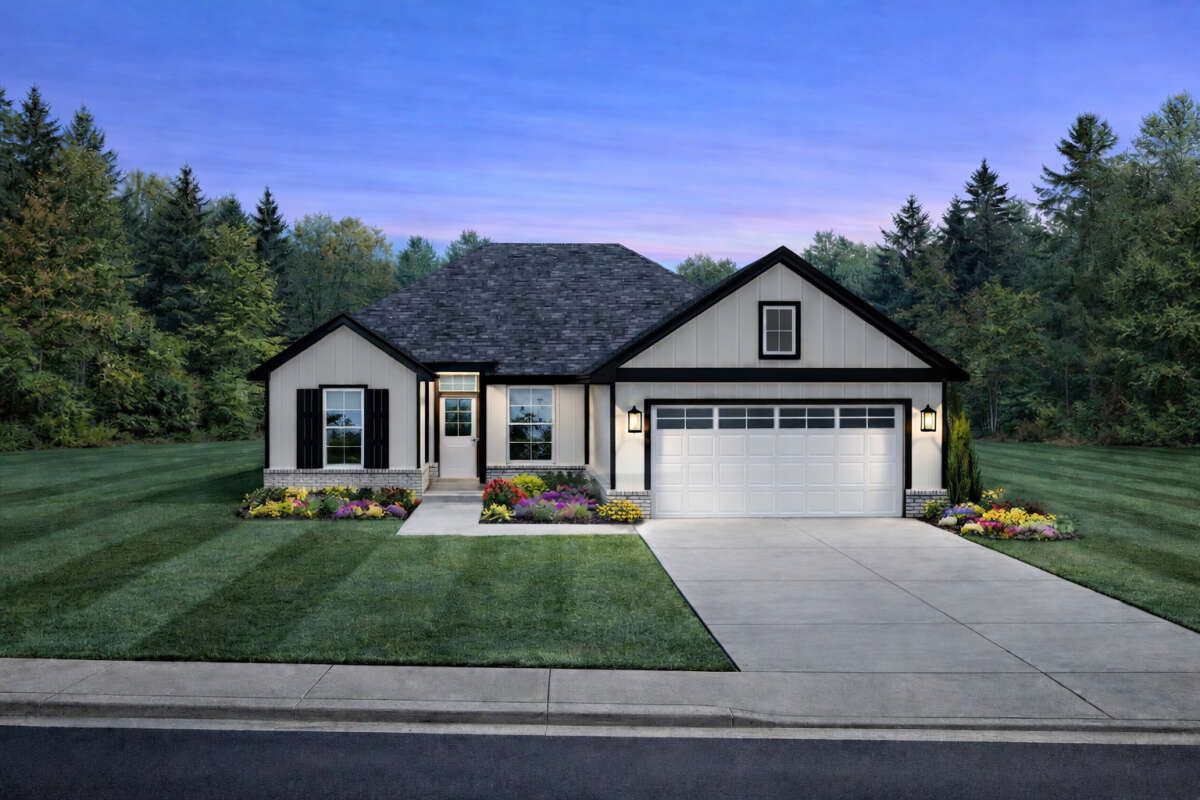 The exterior captures the familiar appeal of modern farmhouse architecture with clean rooflines, symmetrical window placement, and a welcoming covered porch. This porch creates an inviting entry while also extending the living area outdoors, providing a pleasant space for relaxation and social gatherings.Farmhouse designs are known for combining traditional rural inspiration with contemporary details such as large windows and simple siding treatments. These elements allow the home to fit comfortably in both rural settings and modern suburban communities while maintaining timeless curb appeal. 1
