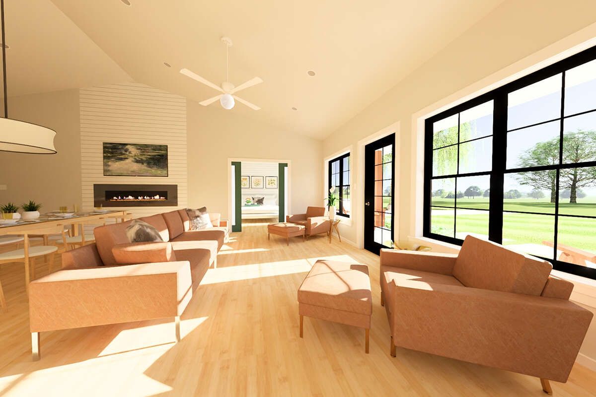 This modern farmhouse plan delivers comfort, charm, and efficiency in a thoughtfully sized package. Its open living core, practical bedroom layout, and inviting exterior make it a home that supports everyday life with ease—simple, welcoming, and designed to feel just right.