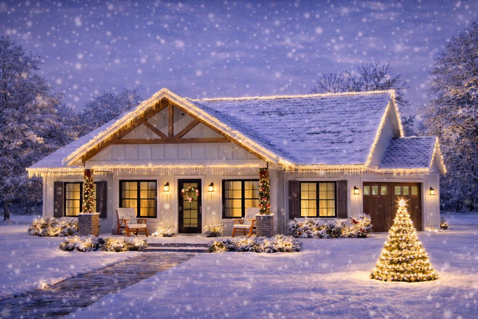 The exterior presents a clean, welcoming farmhouse look with simple rooflines and balanced proportions. 1 Vertical siding accents and thoughtfully placed windows give the home character while maintaining a timeless, understated appearance. 2 A covered front porch anchors the façade, offering a warm welcome and a comfortable spot to enjoy quiet outdoor moments. 3