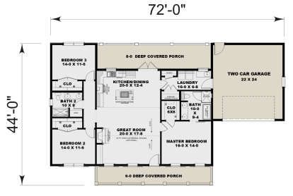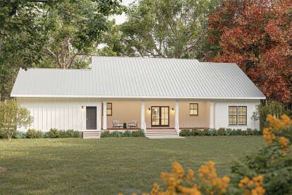 This charming modern farmhouse plan offers approximately 1,615 square feet of well-organized living space featuring three bedrooms and two full bathrooms. Designed for comfort and practicality, the layout combines classic farmhouse warmth with modern open-concept living, making it an excellent choice for small families, retirees, or homeowners seeking an efficient yet stylish single-story home. 0