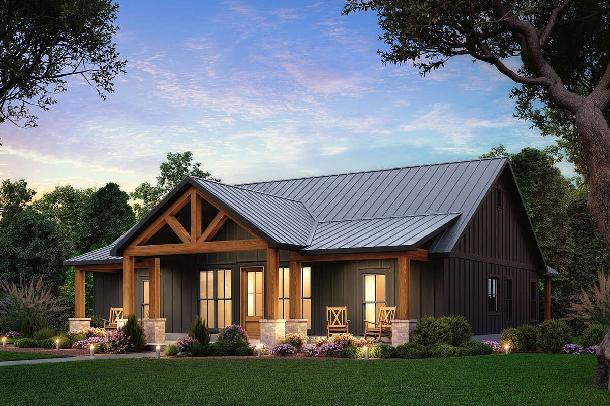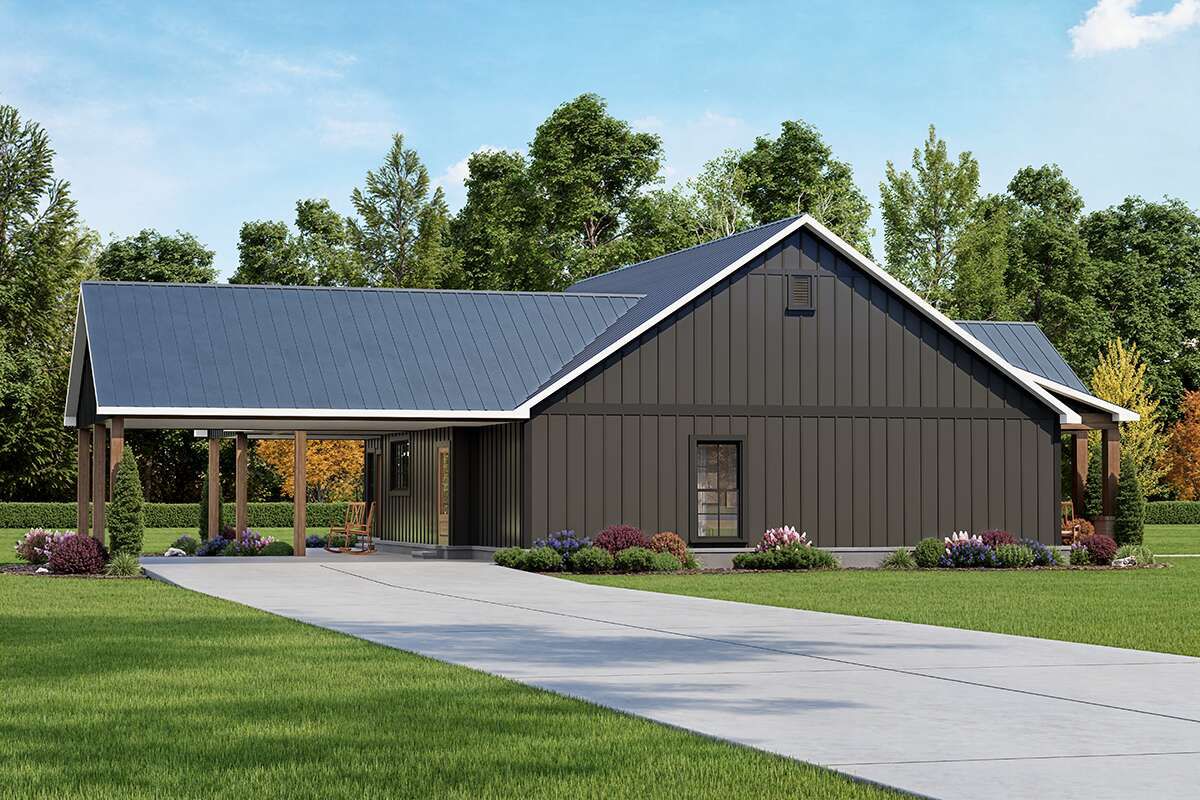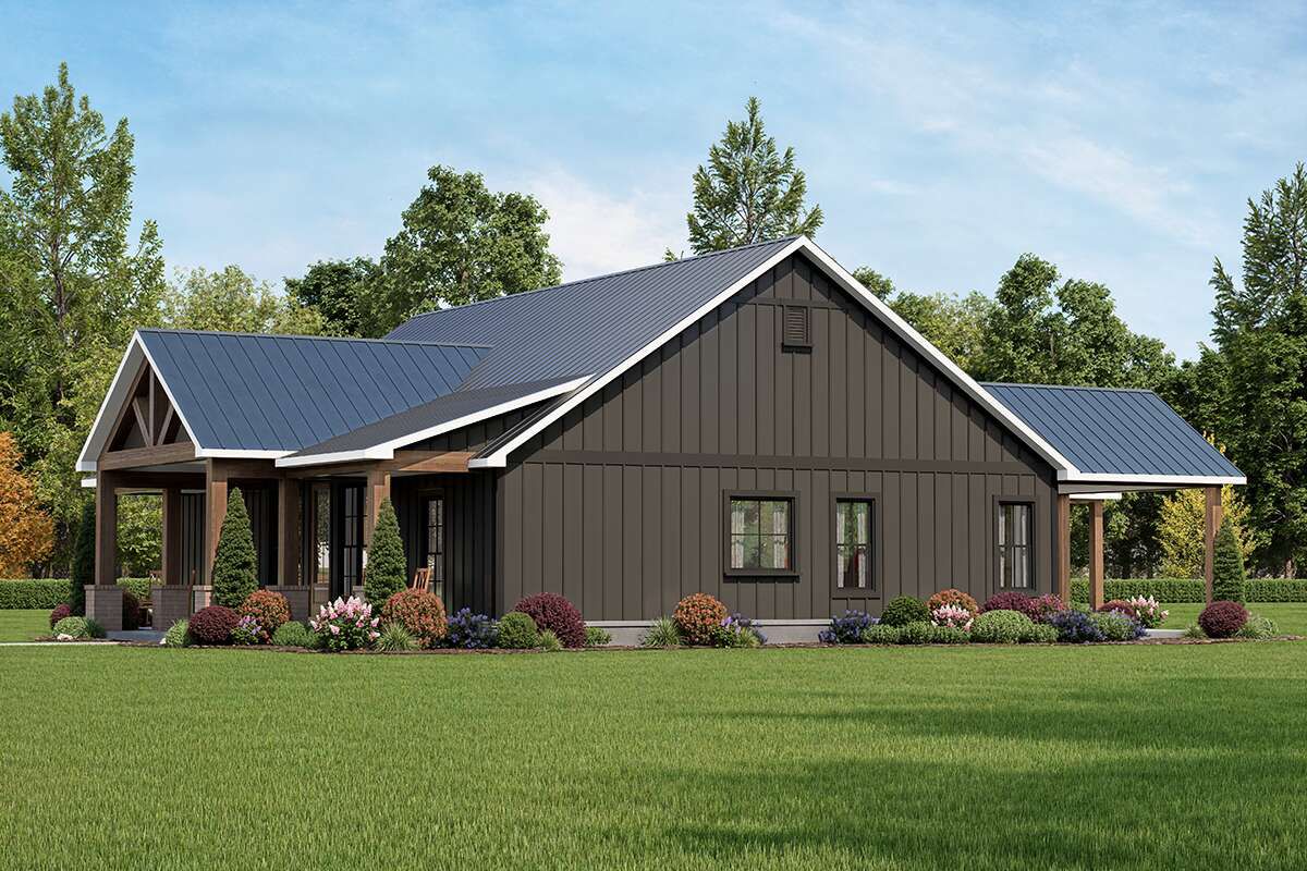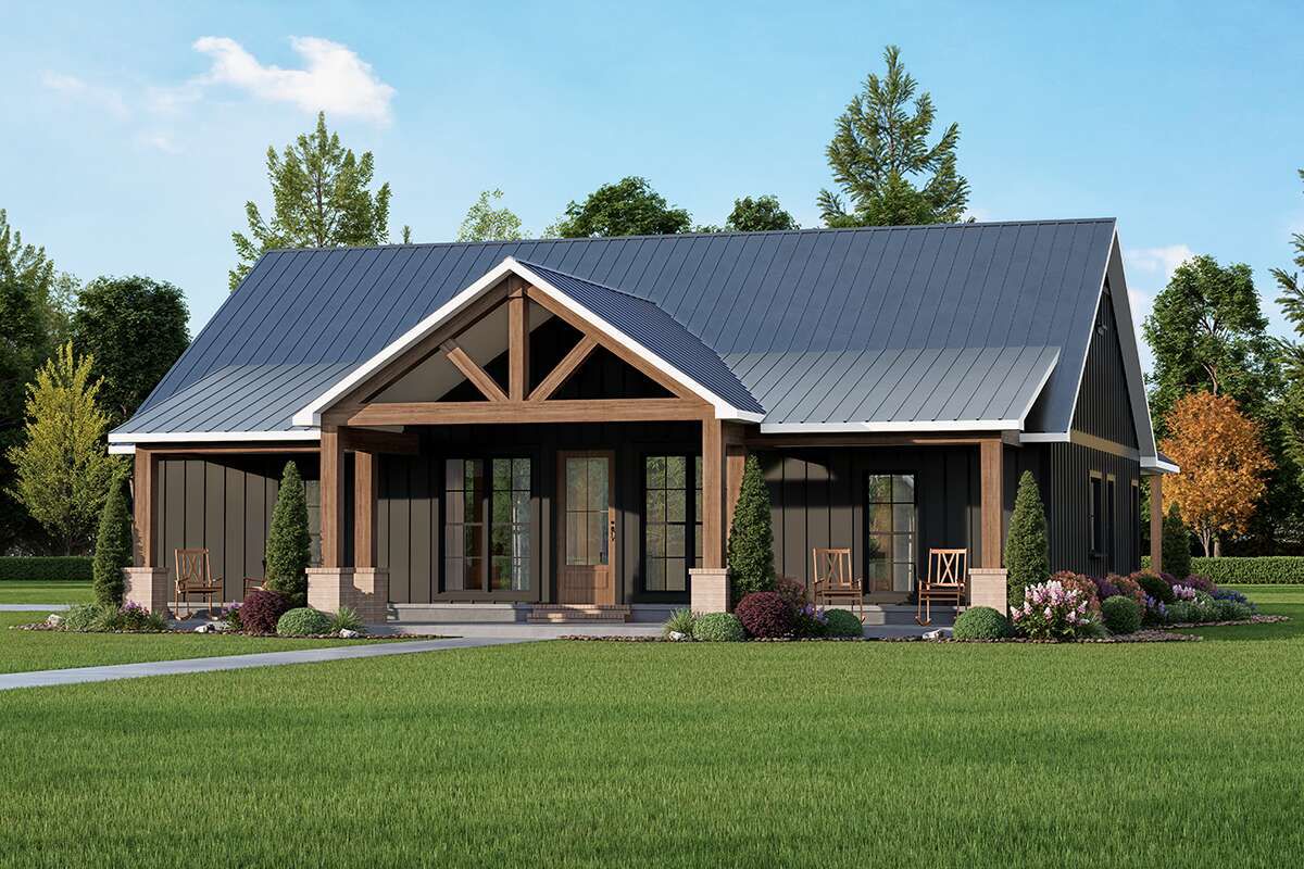 The exterior showcases classic modern farmhouse character with clean vertical siding, strong gable rooflines, and a welcoming covered front porch. The simple but elegant design creates timeless curb appeal while maintaining practicality for everyday family life.Its compact but well-balanced footprint makes it suitable for a wide range of lot sizes, especially suburban and rural settings. 1