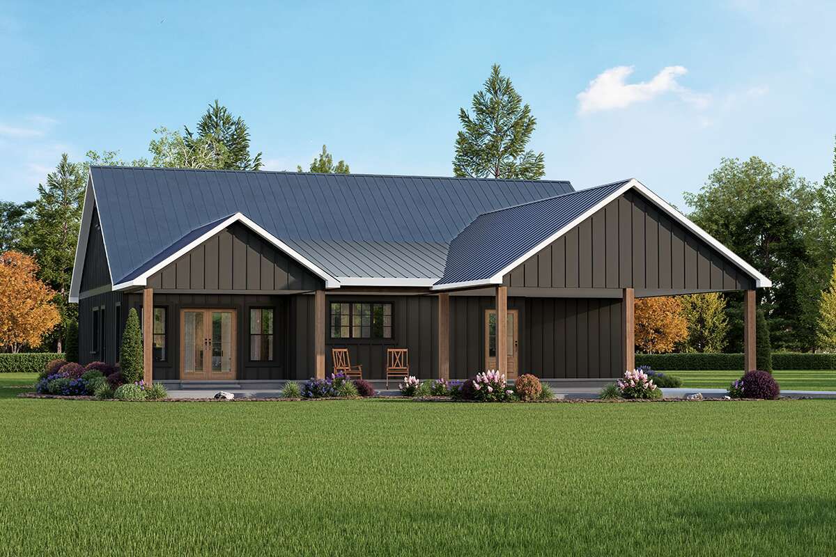 this modern farmhouse plan blends efficient family living with farmhouse charm, making it ideal for homeowners who want practical space, open living, and inviting outdoor areas. 0