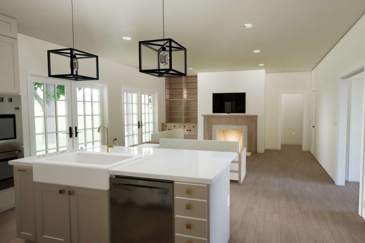 The kitchen is both functional and stylish, featuring ample counter space, modern cabinetry, and a central workspace that supports daily cooking and entertaining.