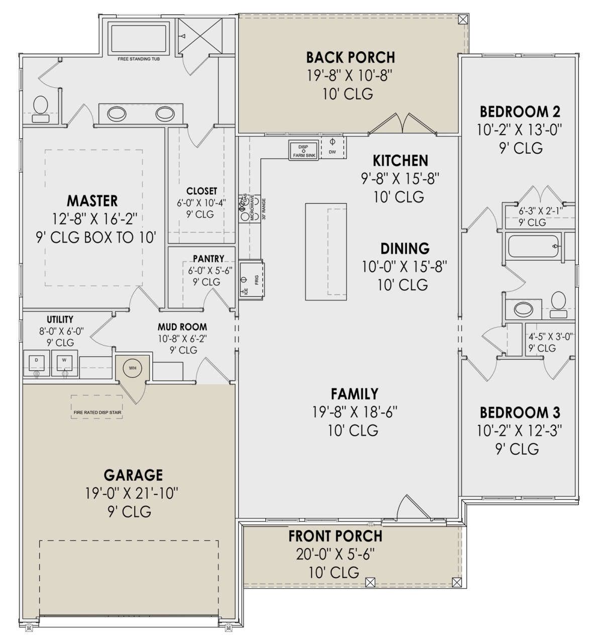 The design incorporates a split-bedroom layout, placing the primary bedroom on one side of the home and the other bedrooms on the opposite side.