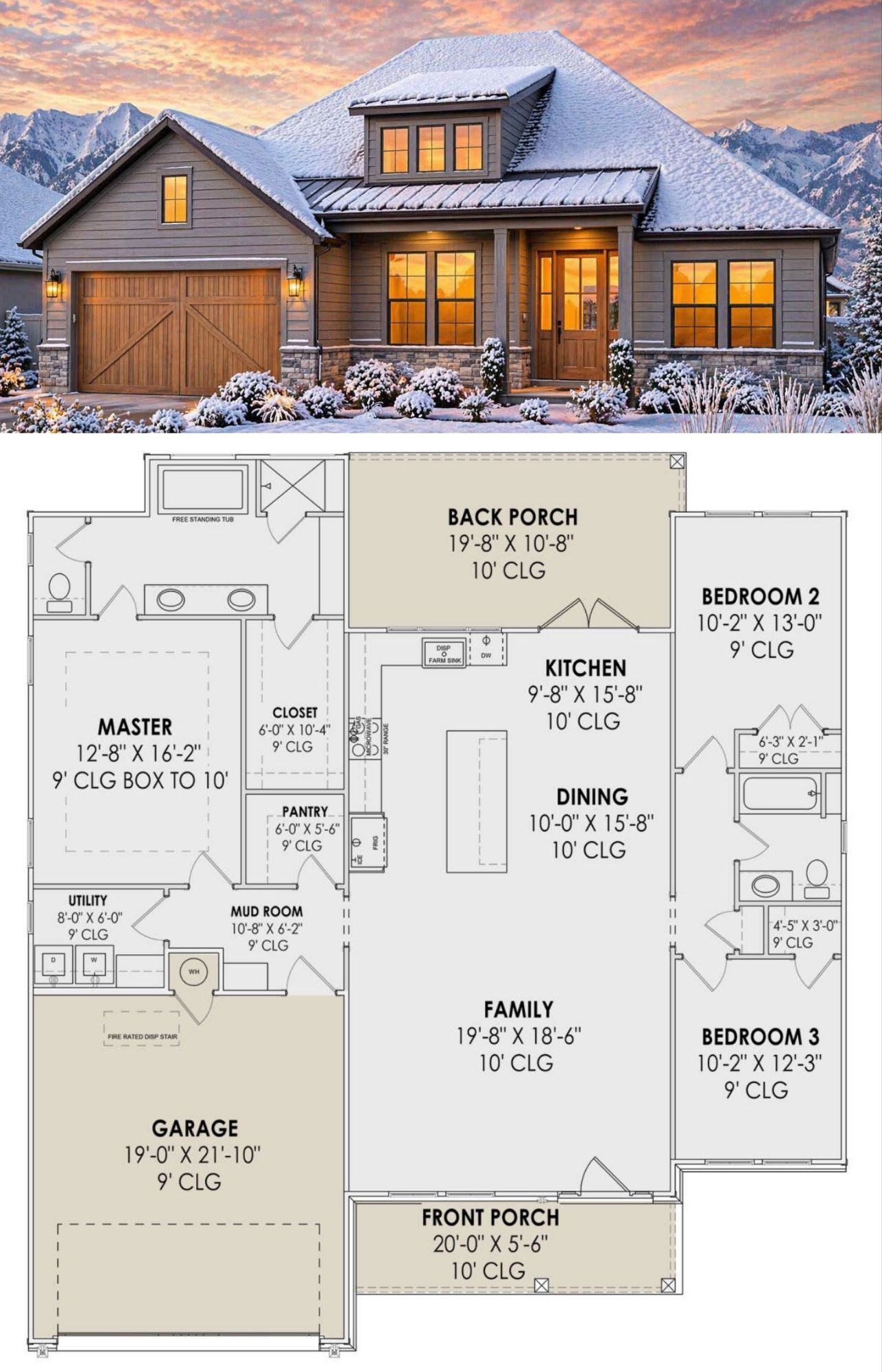 this modern farmhouse plan blends classic farmhouse charm with modern functionality, creating a comfortable and stylish family home.