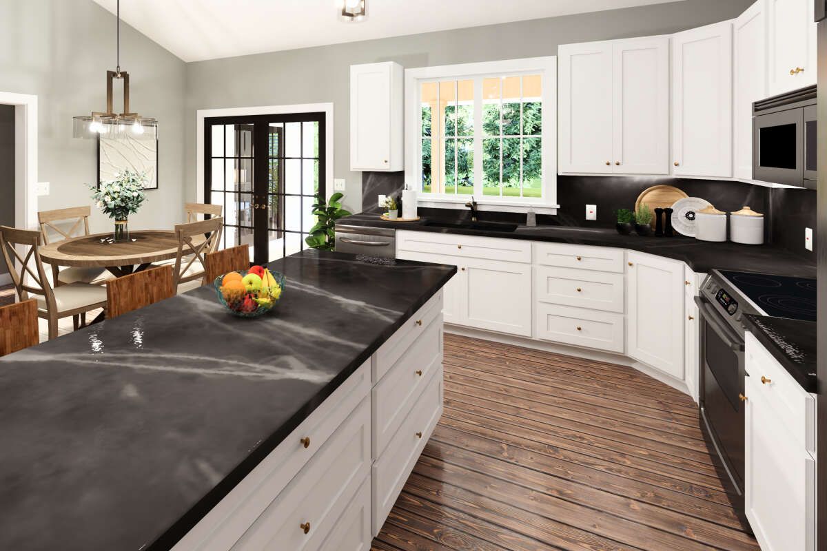 The kitchen sits right in the heart of the home’s daily rhythm, designed to feel functional, efficient, and connected. In a farmhouse home, the kitchen is never just a cooking space—it’s where life happens. This layout supports that by keeping you close to the living and dining areas.