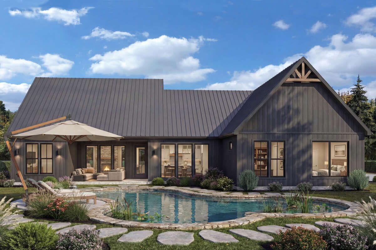 Exterior finishes typically feature board-and-batten or horizontal siding, simple trim detailing, and a gently pitched roof that reflects traditional farmhouse aesthetics while maintaining a contemporary feel. Large windows on the front and sides bring in abundant natural light and emphasize visual connection to the outdoors. 3