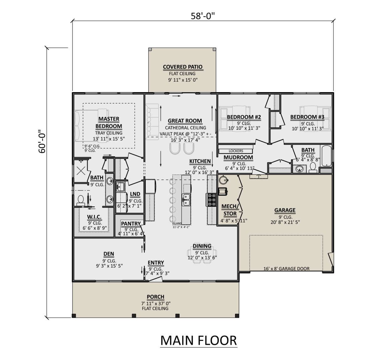 The design incorporates a split-bedroom layout, placing the primary suite on one side of the home and the other bedrooms on the opposite side.