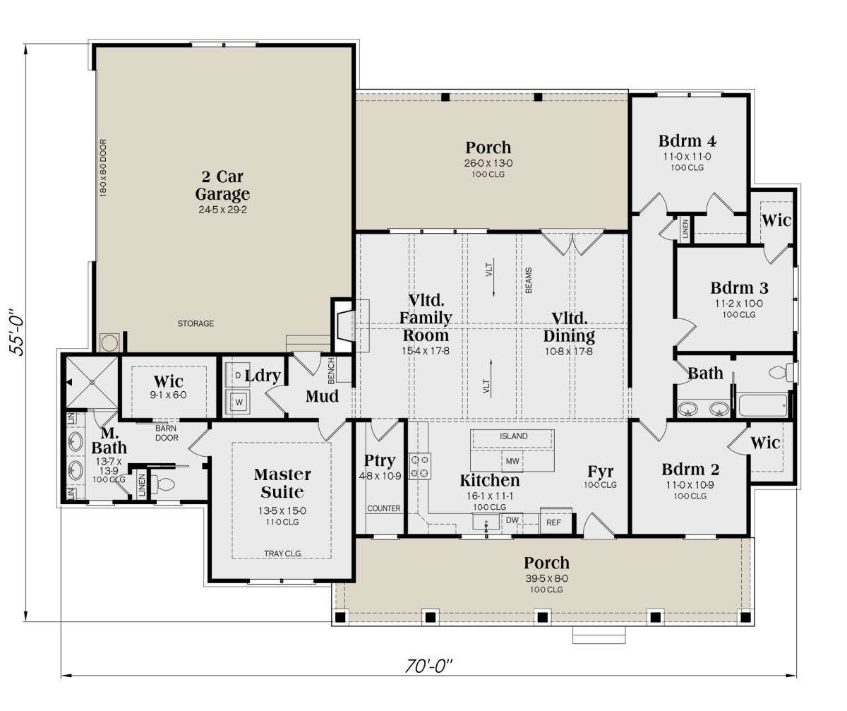 This modern farmhouse plan offers a perfect balance of space, comfort, and efficiency. With its four-bedroom layout, open living design, and inviting outdoor spaces, it is an excellent choice for building a stylish and practical family home.