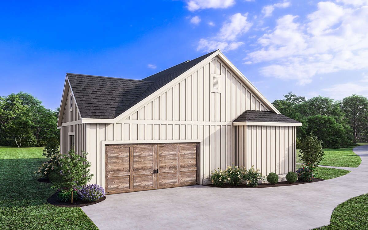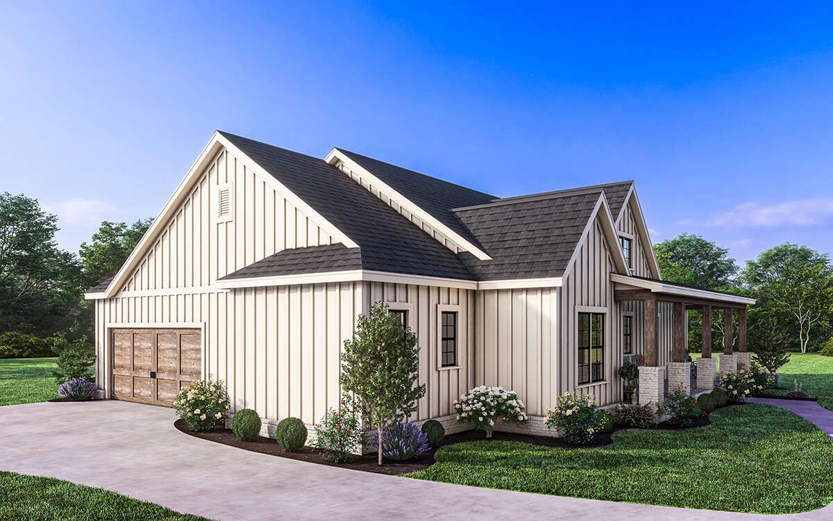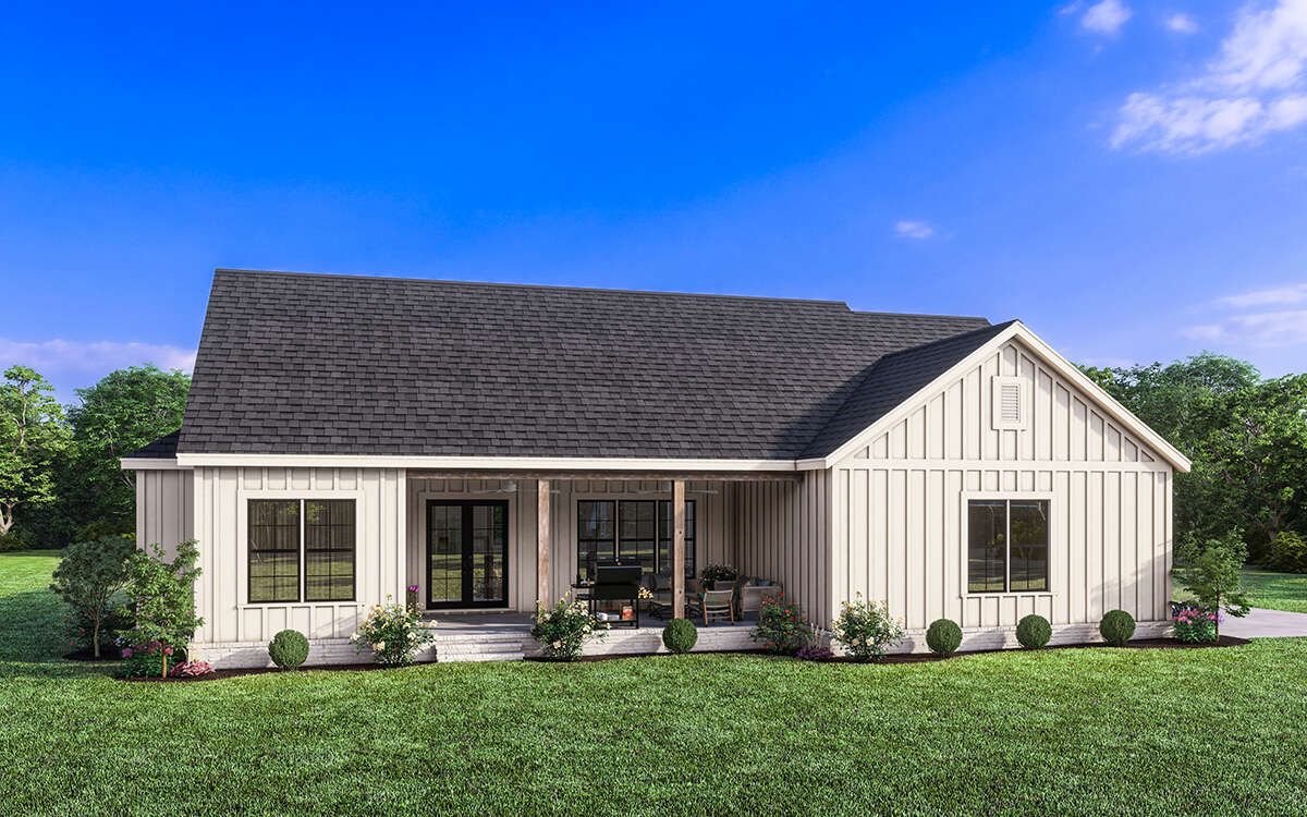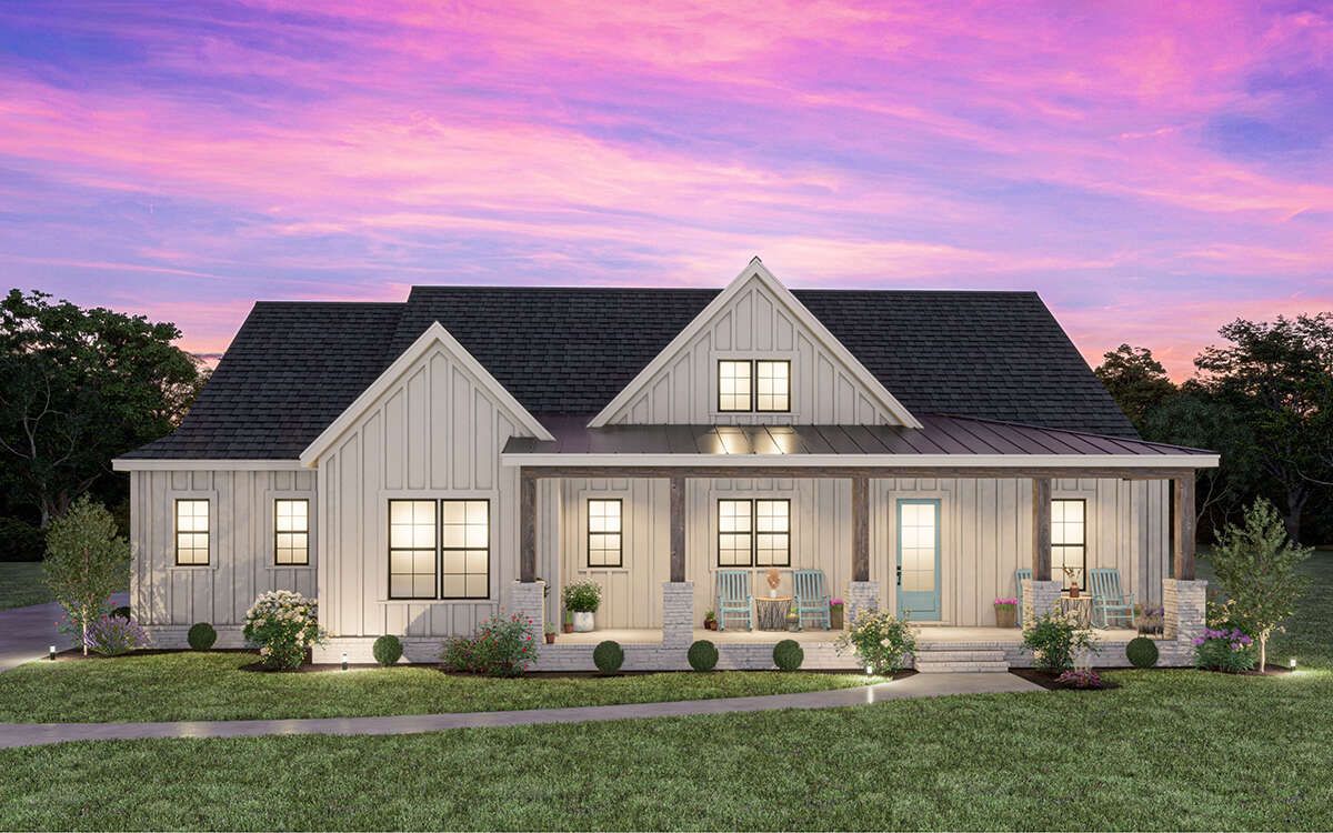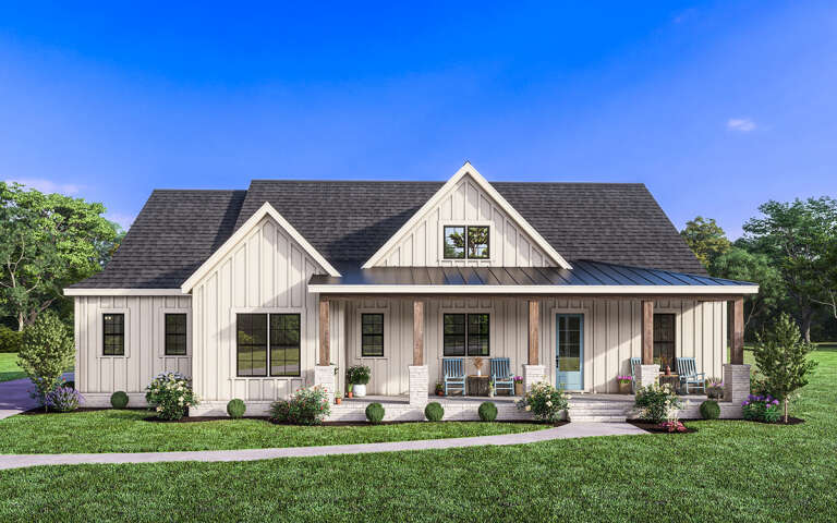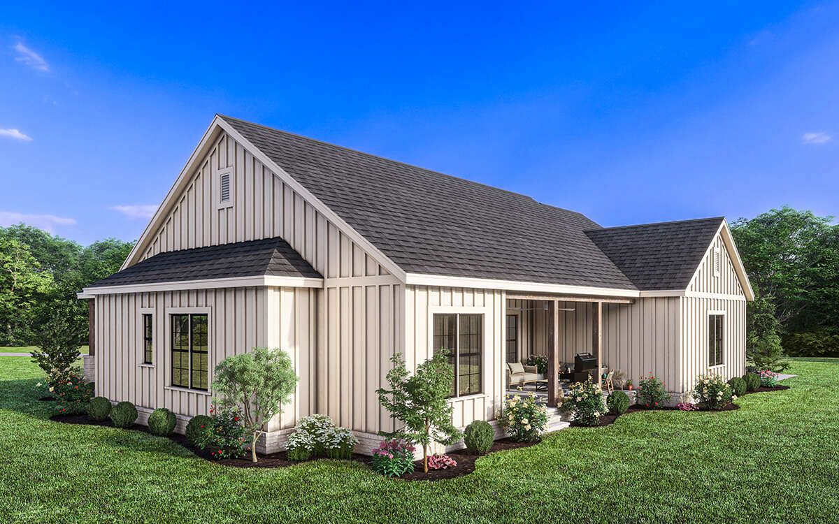 this modern farmhouse plan combines modern efficiency with classic farmhouse charm, making it ideal for comfortable everyday living.