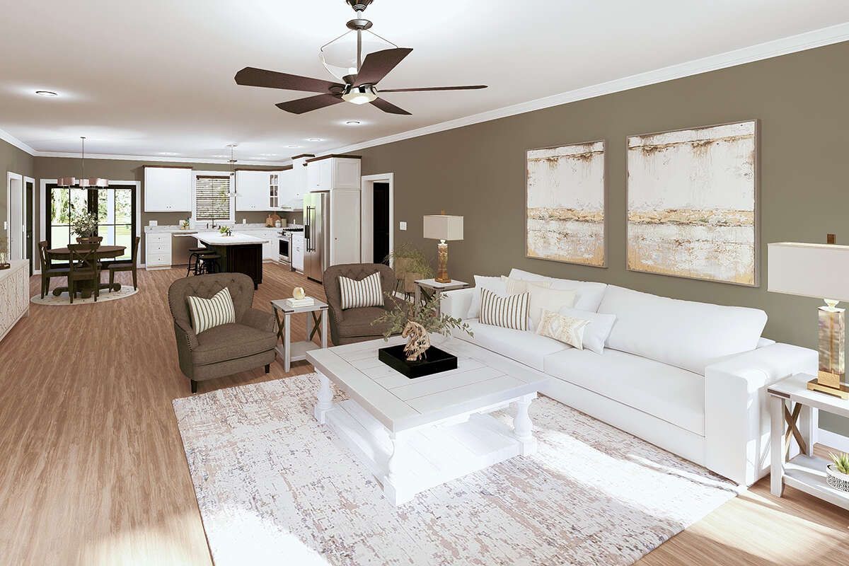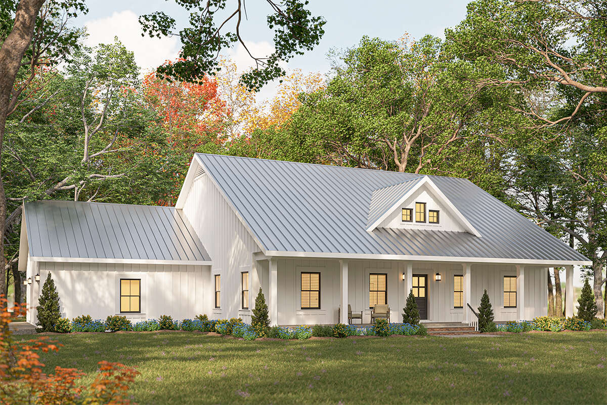 This modern farmhouse plan offers the space homeowners want with the warm charm farmhouse style is known for. With an open main living layout, three flexible bedrooms, and two full bathrooms for daily convenience, it supports real life beautifully. It’s spacious, comfortable, and designed for long-term living—making it a smart choice for anyone who wants farmhouse warmth with a roomy, practical layout.