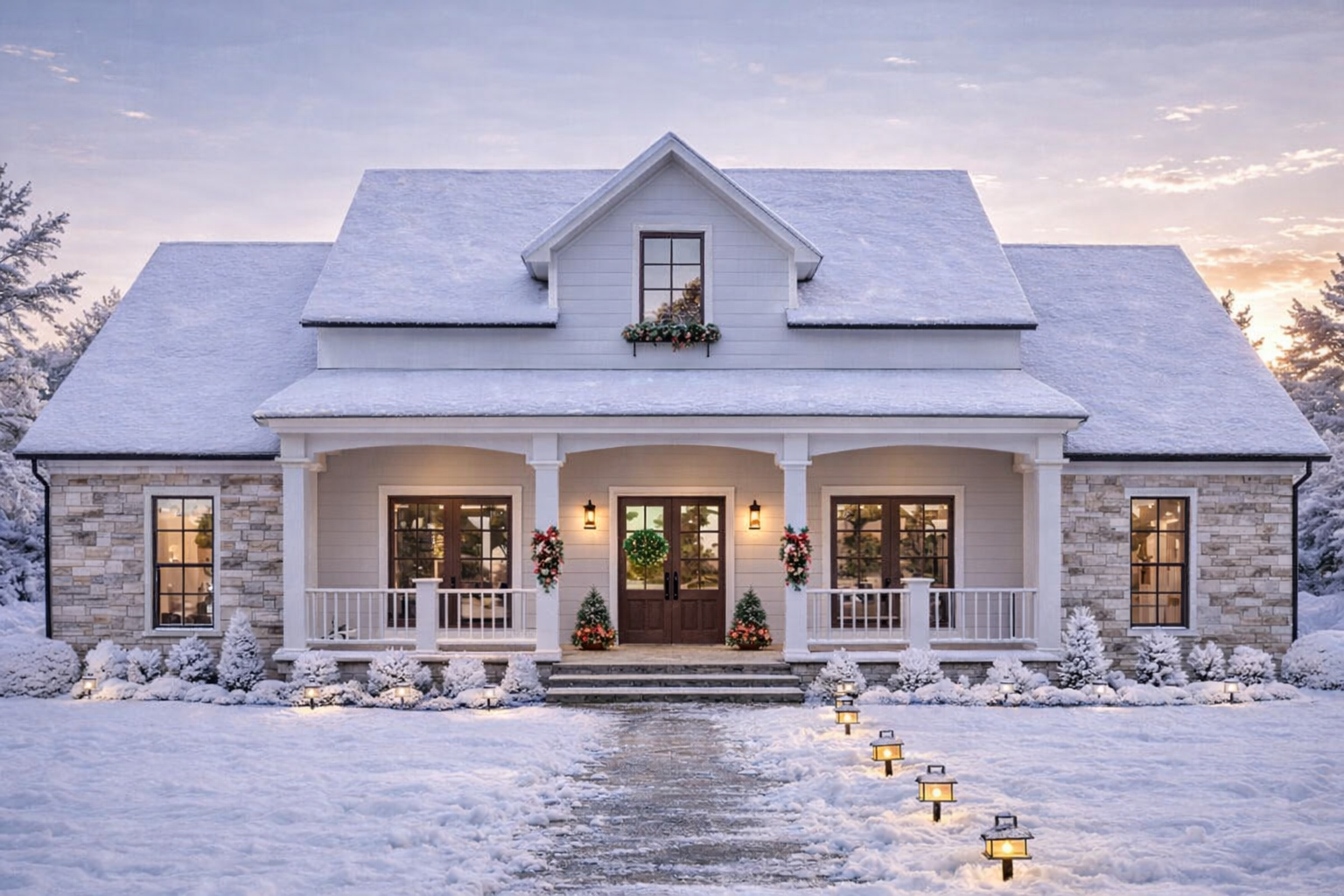 The exterior captures the essence of modern farmhouse style with a balanced footprint measuring approximately 57 feet wide and 74 feet deep. 1 Clean lines, large windows, and classic detailing create a welcoming yet refined curb appeal.