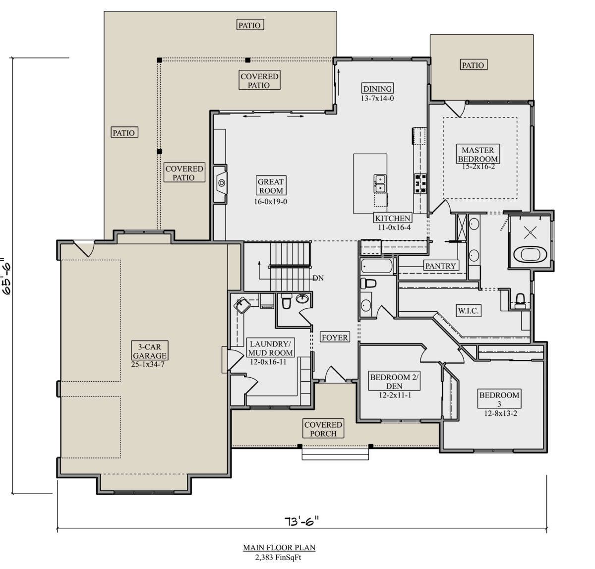 All 2,383 square feet of living space is arranged on one level, creating a convenient and accessible layout. 4 The design emphasizes open-concept living while maintaining privacy through a thoughtful bedroom arrangement.