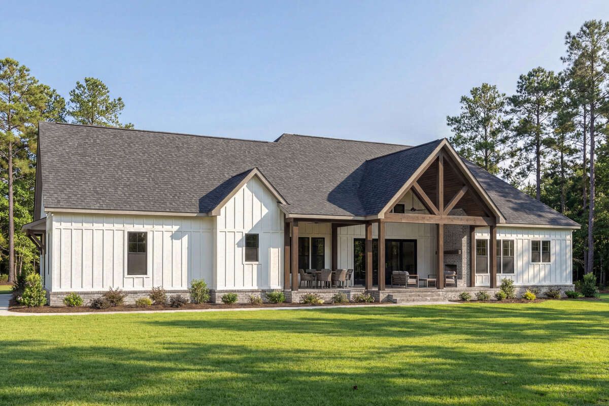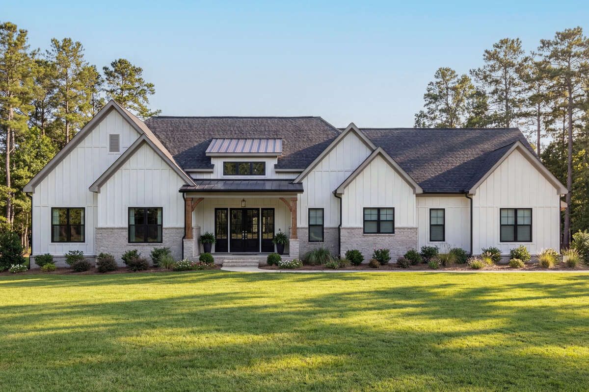 The exterior showcases a bold farmhouse design with a wide footprint, clean lines, and a welcoming presence. Its large scale gives it strong curb appeal, making it ideal for spacious plots and open surroundings.