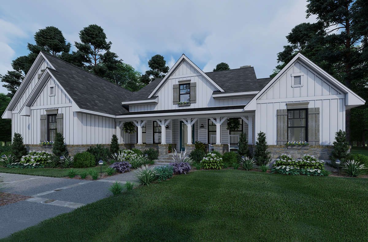 This modern farmhouse plan offers a perfect combination of elegance, space, and functionality. With its open layout, three-bedroom design, and flexible living areas, it is an excellent choice for building a comfortable and stylish family home.
