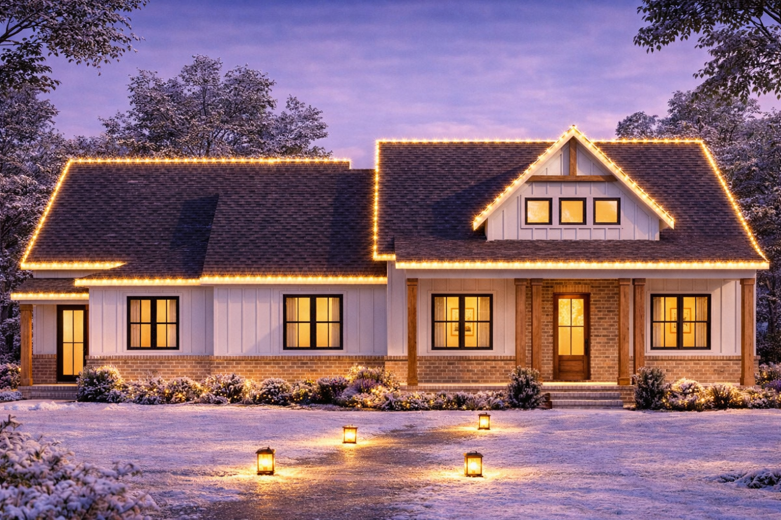 This design pairs beautifully with simple landscaping—low shrubs, neat pathways, and warm lighting around the entry. It’s the kind of house that looks welcoming in every season, whether you keep the yard minimal or dress it up with greenery and seasonal decor.