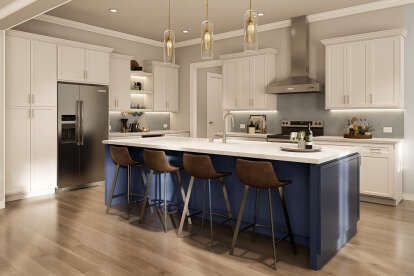 At the heart of this plan lies a spacious open living area that combines the living room, kitchen, and dining space into one cohesive zone. 7 Vaulted ceilings and large windows create a bright, airy atmosphere that brings natural light into every corner. 8 These open lines of sight give the space a social, welcoming feel — perfect for family routines, casual gatherings, or larger celebrations. 9