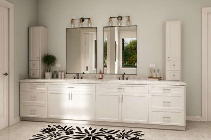The primary bedroom suite is tucked away for peaceful evenings and relaxed mornings. 13 Its well-proportioned interior welcomes a comfortable bed and furniture arrangement, while large windows bring natural light into the space. 14 The attached ensuite bathroom is thoughtfully designed with dual vanities and a separate shower and soaking tub, creating a spa-inspired retreat that supports everyday routines with ease. 15