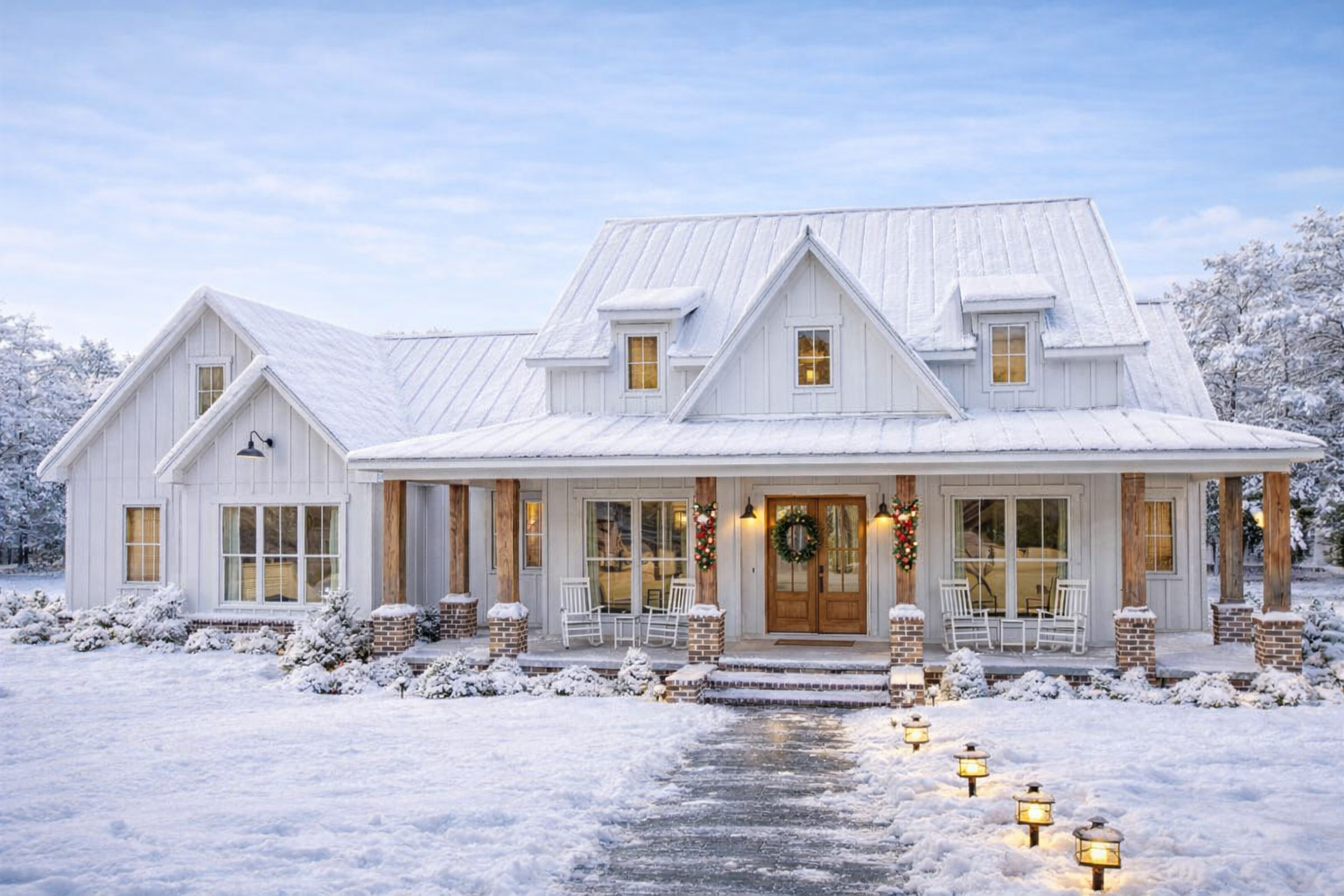 The exterior reflects the timeless charm of modern farmhouse architecture, blending clean lines with rustic character. With an approximate footprint of 72 feet wide and 62 feet deep, the home offers a balanced and substantial presence on a variety of lot sizes. 1