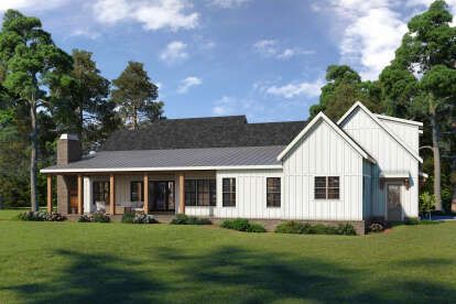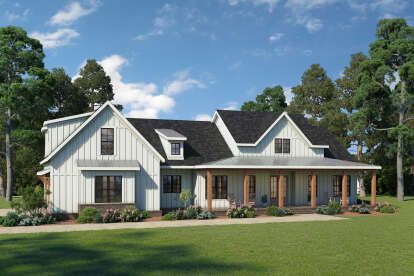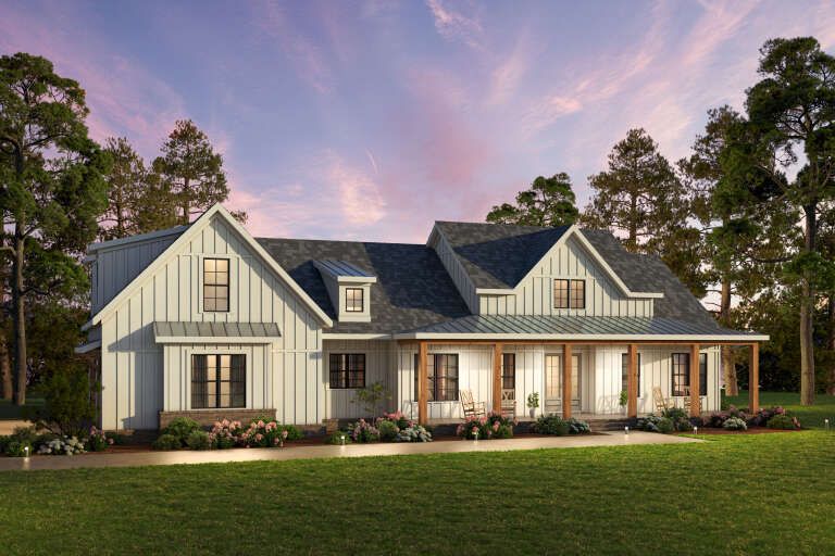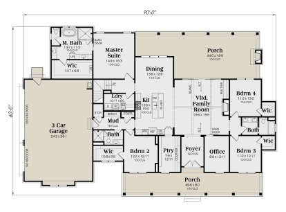 The exterior presents a striking modern farmhouse façade with balanced proportions and clean architectural lines. With an overall width of about 90 feet and a depth of around 60 feet, the home occupies a commanding footprint that suits larger residential or rural lots. Covered front and rear porch areas extend living space outdoors while enhancing the home’s inviting character.1