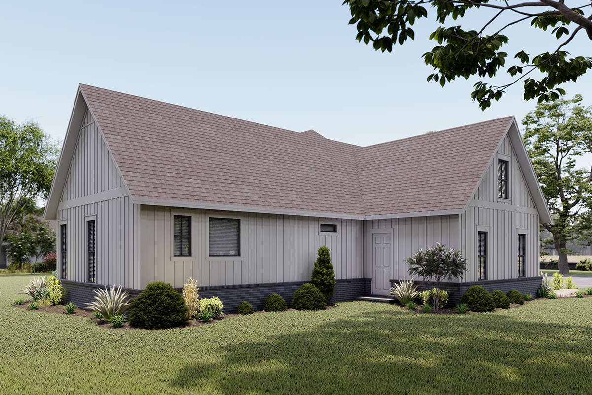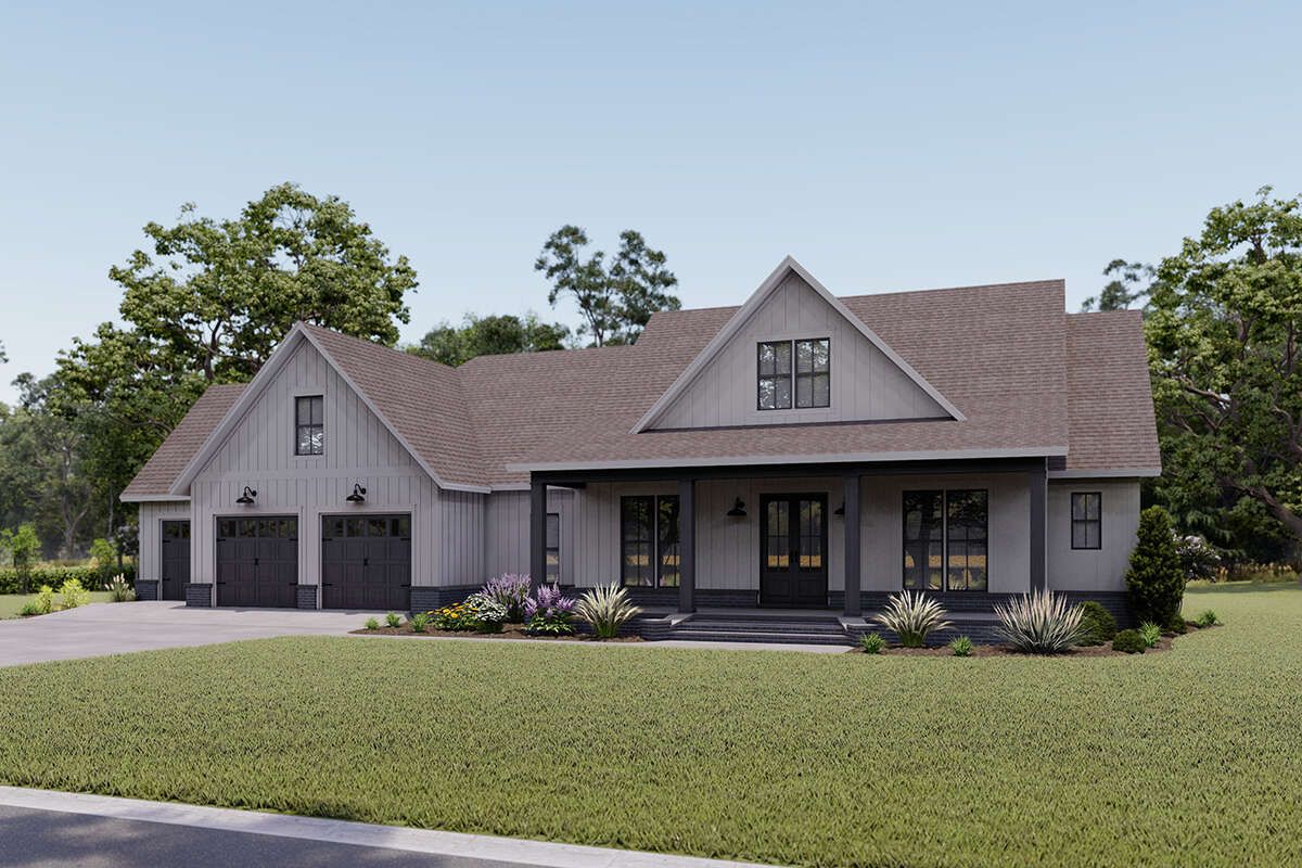 The exterior showcases a clean and timeless farmhouse design with strong lines, a wide footprint, and inviting curb appeal. This style blends rustic warmth with modern simplicity, making it suitable for both rural and suburban settings.