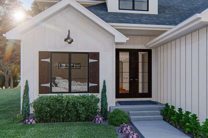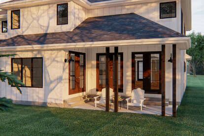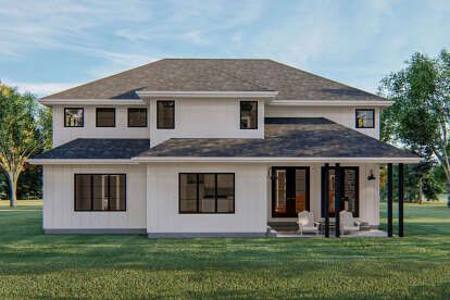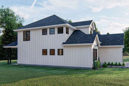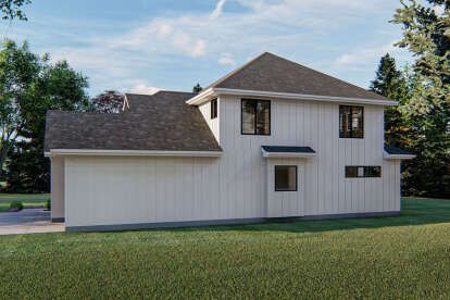 Large windows across the front and rear elevations bring natural light into the interior and help establish a strong connection between indoor living spaces and the outdoor environment. Traditional siding details and decorative trim contribute to the timeless aesthetic associated with farmhouse-style homes.