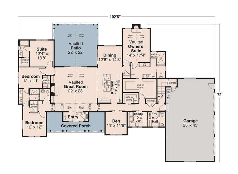 The overall footprint of approximately 102 feet 6 inches wide by 72 feet deep provides a substantial yet balanced plan suitable for generous indoor spaces and outdoor extensions. Standard first-floor ceiling heights of around 10 feet create a comfortable interior volume, while the half-story bonus space adds flexibility. 16