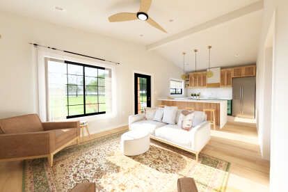 Inside, this farmhouse plan emphasizes efficiency and connection between main living areas. The layout is open and intuitive, with living, dining, and kitchen spaces designed for comfortable everyday living without wasted square footage. 4