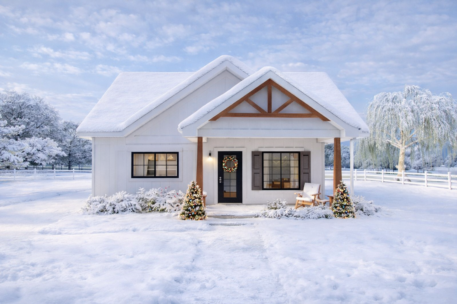 Exterior detailing typically highlights simple siding, clean trim, and a gentle roof pitch that together create a balanced architectural style — both modern and farmhouse inspired. 3