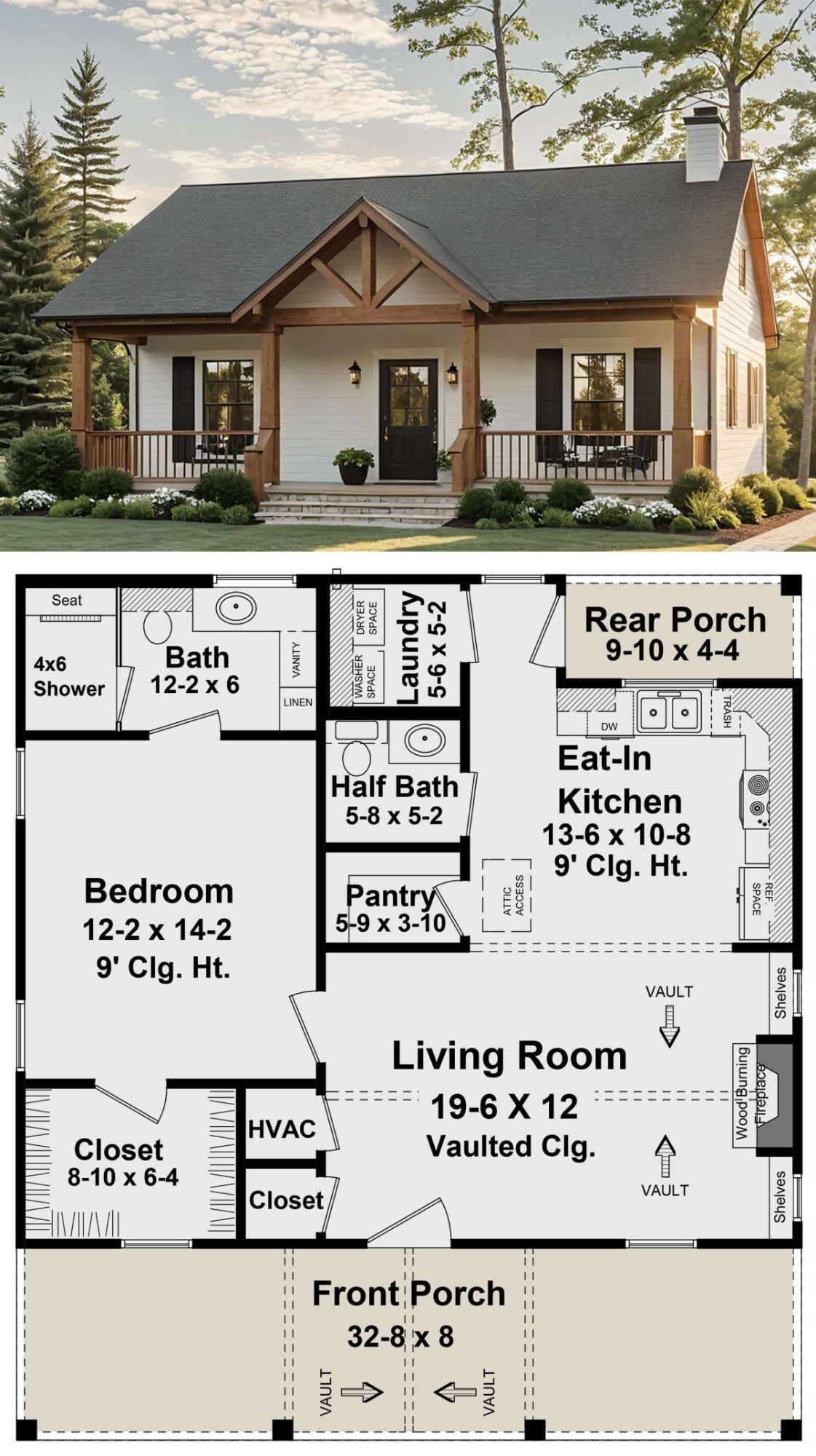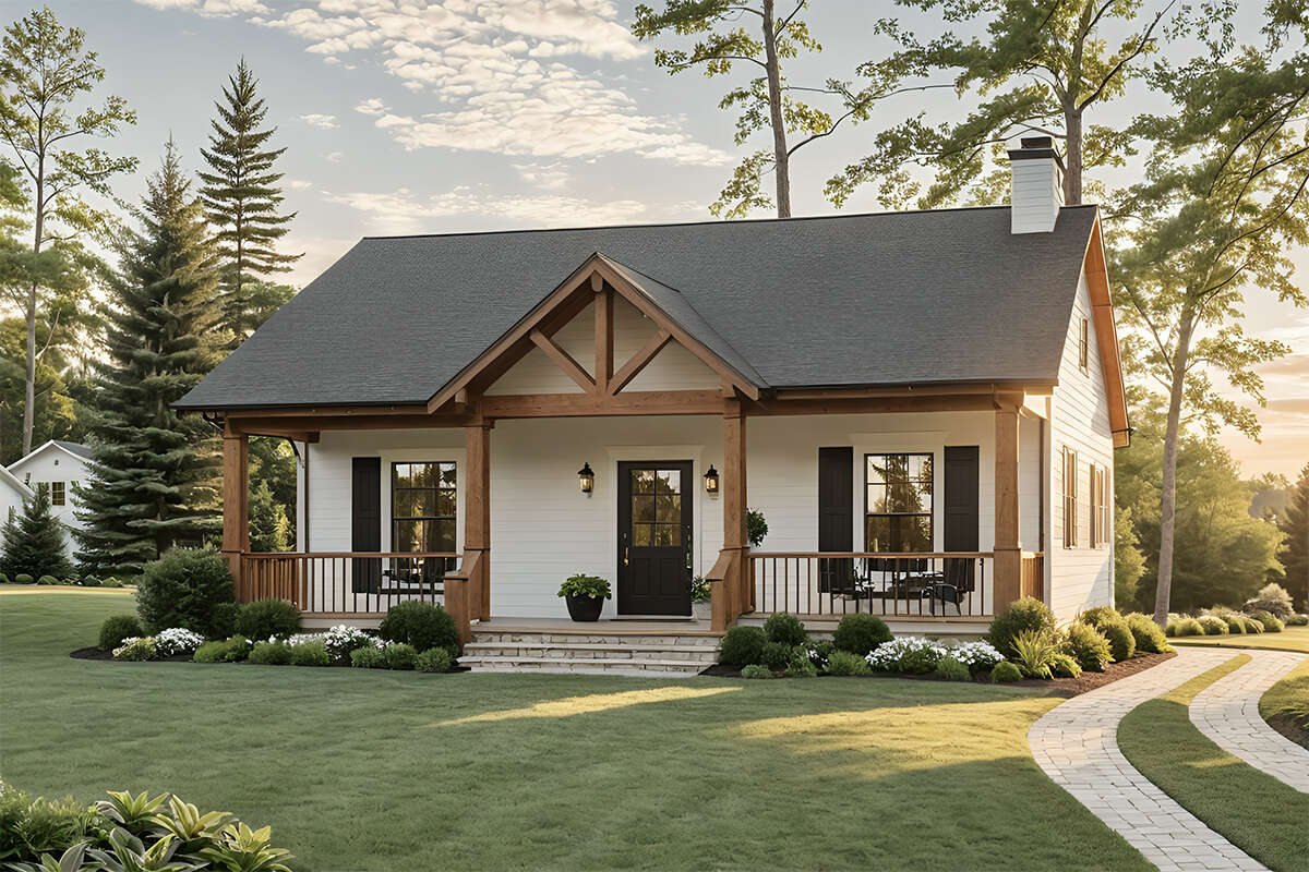 This modern farmhouse plan offers a smart blend of simplicity, charm, and practicality. With its open living layout, private bedroom suite, and guest-friendly half bath, it is an excellent choice for building a stylish small home with maximum efficiency.