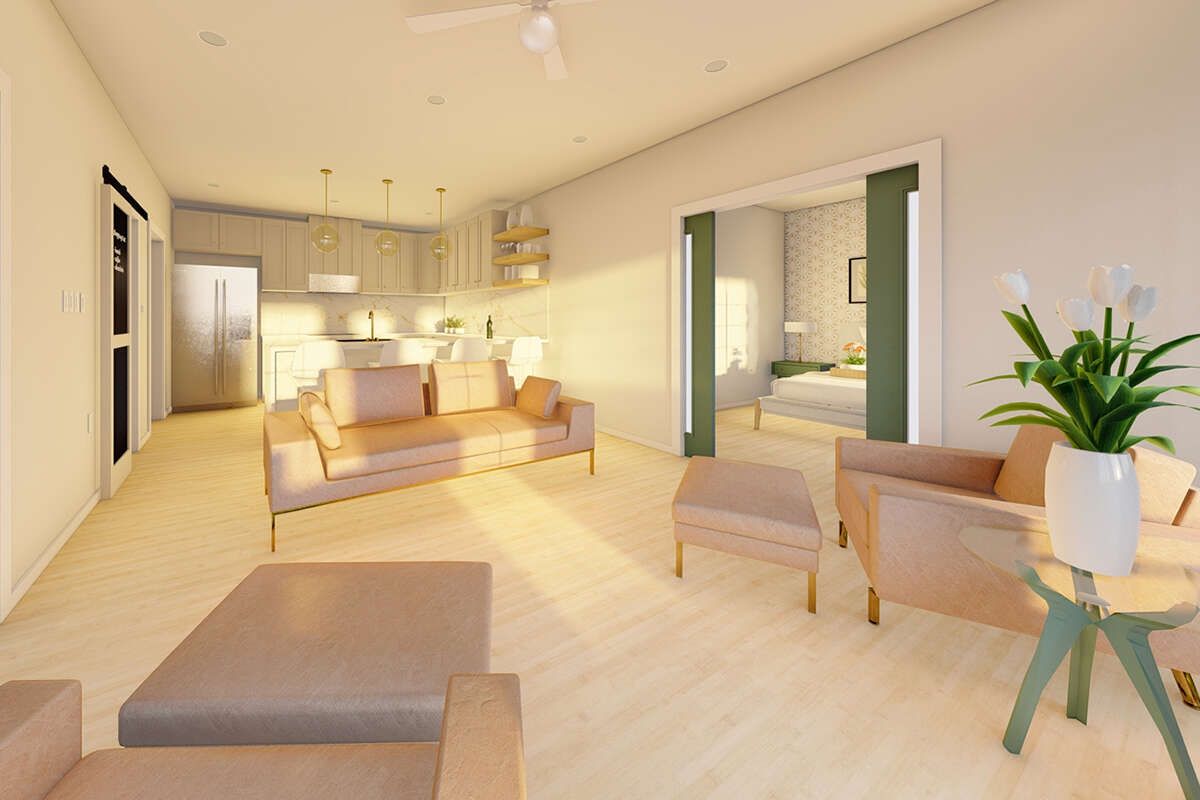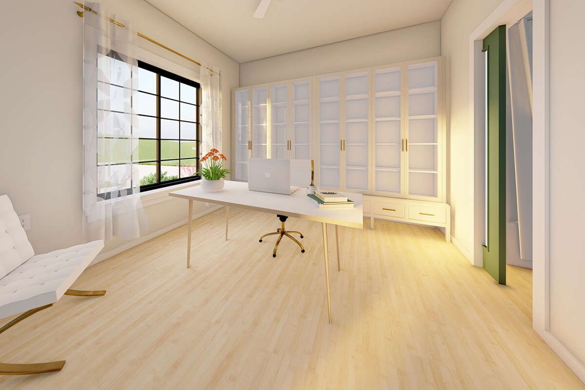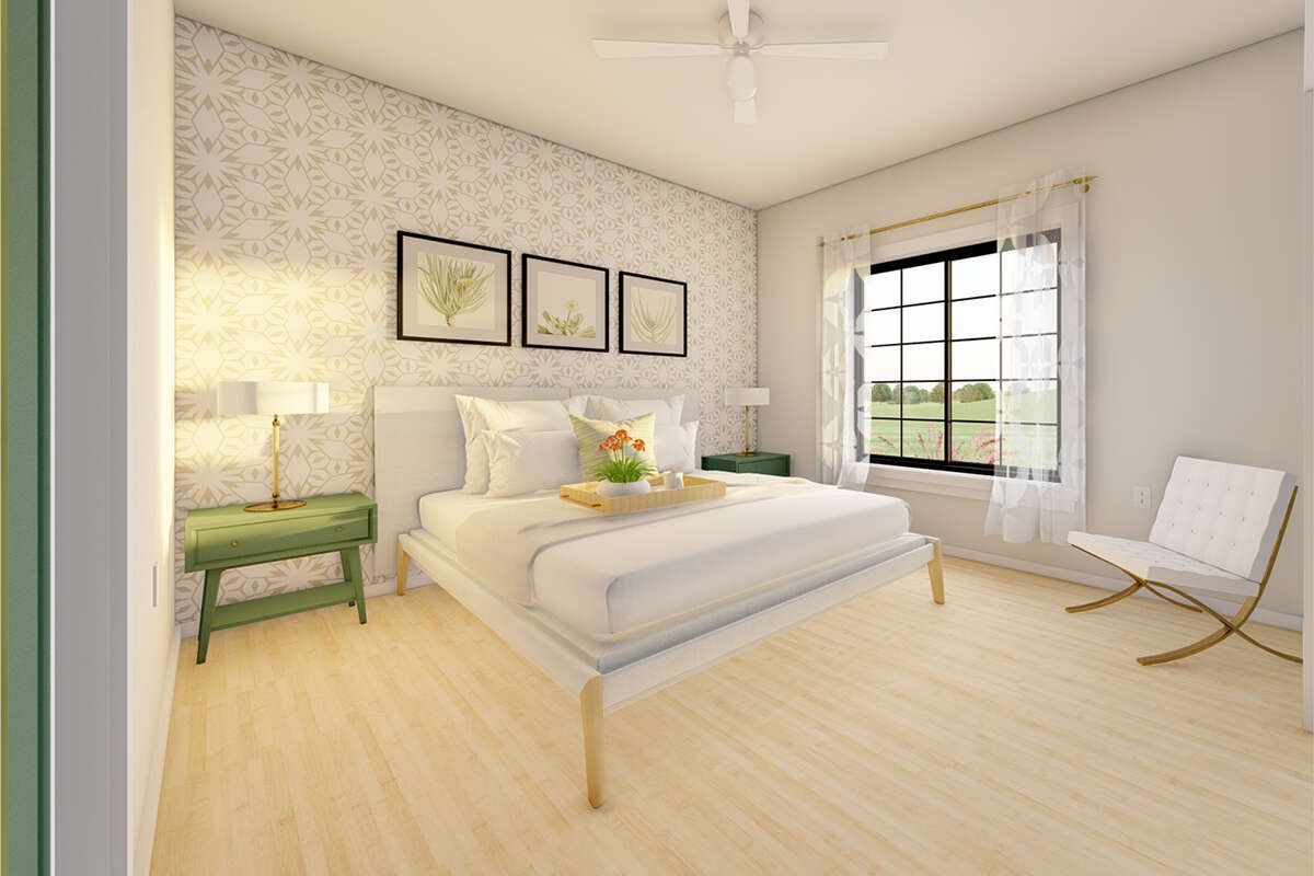 The primary bedroom is designed to feel restful and private, giving you a comfortable place to unwind. In a compact home, the primary bedroom still needs to feel like a true retreat, and this plan delivers that calm atmosphere.