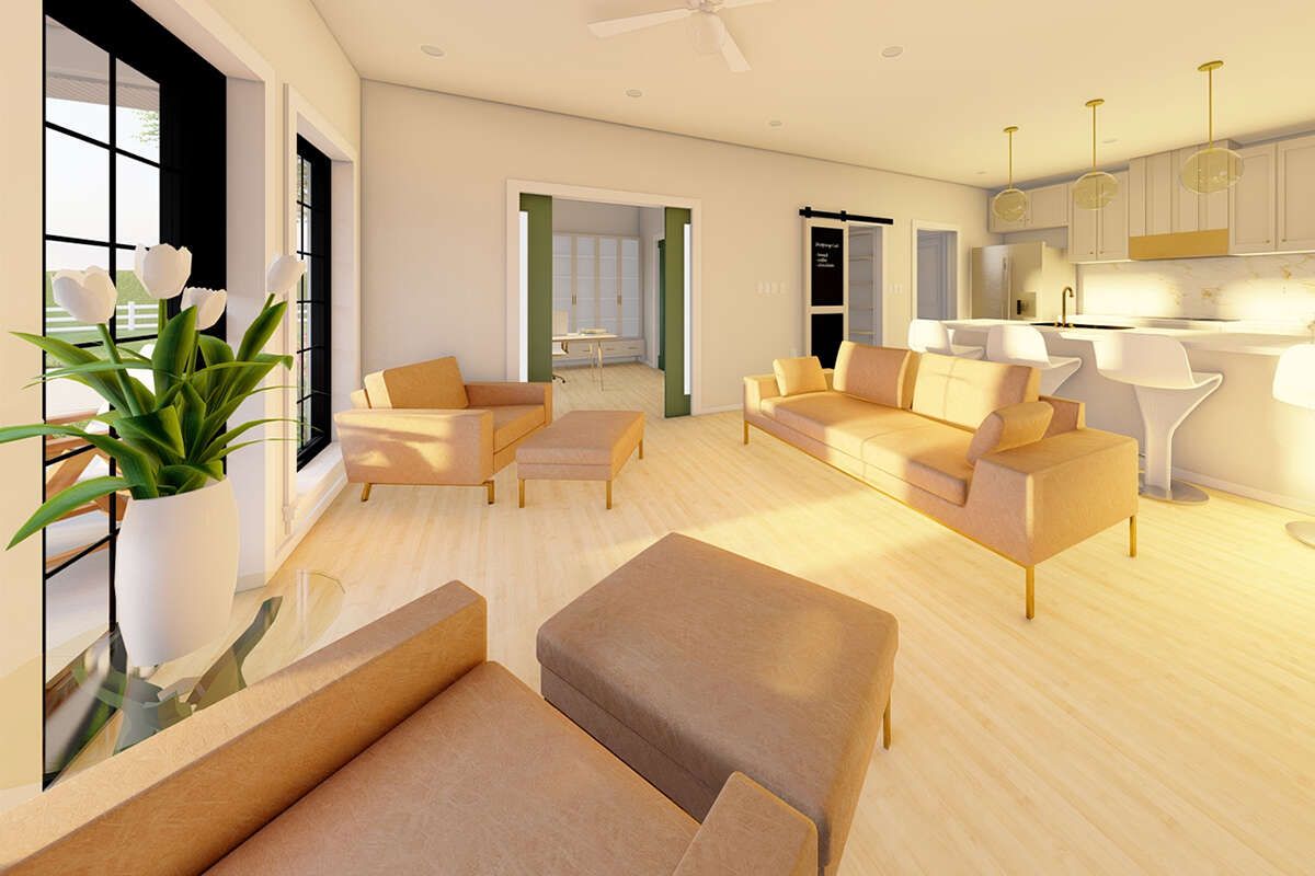 Modern Farmhouse Plan – ~988 Sq Ft of Warm, Open Living with 2 Bedrooms and 2 Full Bathrooms