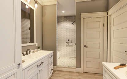 This plan includes two full bathrooms and one conveniently located half bath. The shared full bathroom serves the secondary bedrooms, while the half bath supports guests and social spaces without interrupting the flow of daily life.