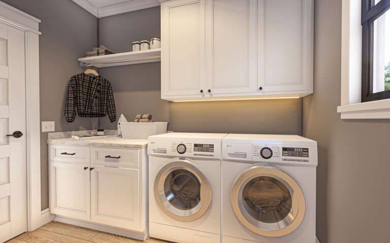 A dedicated laundry area helps streamline household chores and keeps necessary tasks contained and organized. Integrated storage throughout the home supports tidy living and keeps everyday items within reach without cluttering living zones.