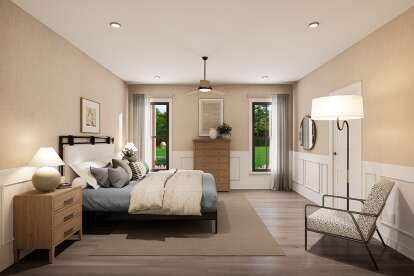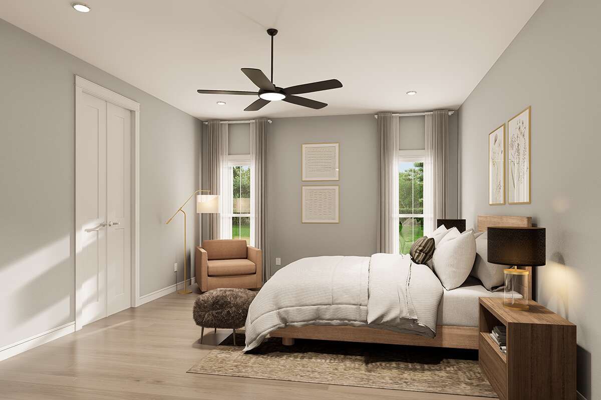 The primary suite occupies its own wing, tucked away for privacy and peaceful rest. 13 Large windows bring in light, fostering a calming ambiance at the end of the day. 14 The attached full bathroom offers thoughtful touches and space for everyday ease, likely with dual vanities, a walk-in shower, and generous closet storage that keeps the suite organized and serene. 15