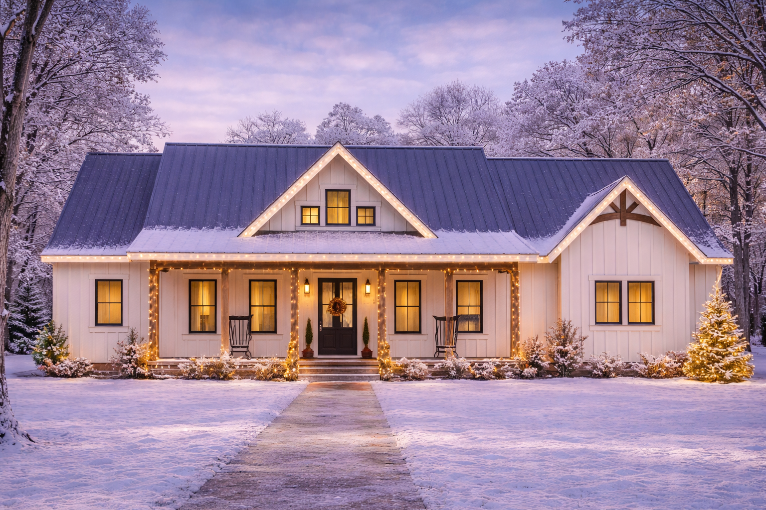 The exterior showcases classic modern farmhouse character with crisp rooflines, board-and-batten or mixed siding details, and generous front porch space — inviting and welcoming from the moment you arrive. 1 A covered front porch extends the living space outdoors, perfect for enjoying morning coffee or evening conversations. 2 Ample windows enhance the façade and bring natural light inside, creating a bright and cheerful exterior presence. 3