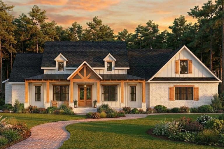 The exterior blends classic farmhouse charm with modern proportions. With a footprint roughly 80′-10″ wide × 62′-2″ deep, it has a comfortable presence on standard lot sizes without feeling overwhelming. 1 A covered front porch offers a welcoming greeting for guests and a peaceful place to enjoy your morning coffee. 2 The clean architectural lines, varied roof pitches, and thoughtful window placement give this home timeless curb appeal with a contemporary edge. 3