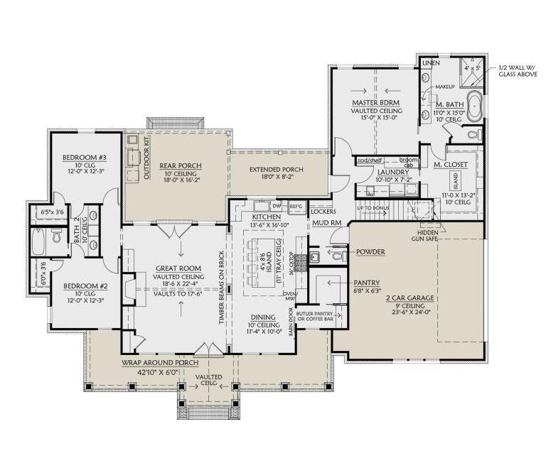 - Layout Features: Open plan living/kitchen/dining, split bedrooms, vaulted ceilings, pantry and mudroom areas. 24