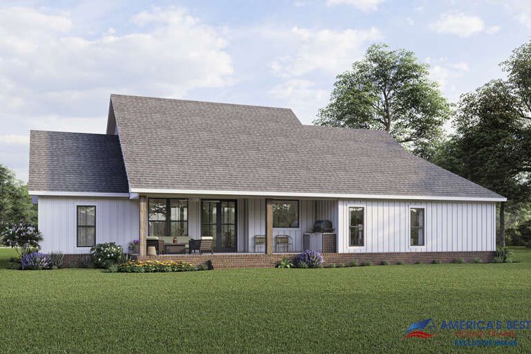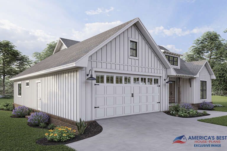 The exterior showcases classic modern farmhouse character with clean lines, balanced proportions, and crisp board-and-batten styling. 1 A covered front porch spans part of the façade, offering an inviting space for rocking chairs and morning coffee. 2 The overall footprint of about 71′-6″ wide × 49′ deep gives this plan a strong street presence while still fitting comfortably on many lots. 3