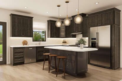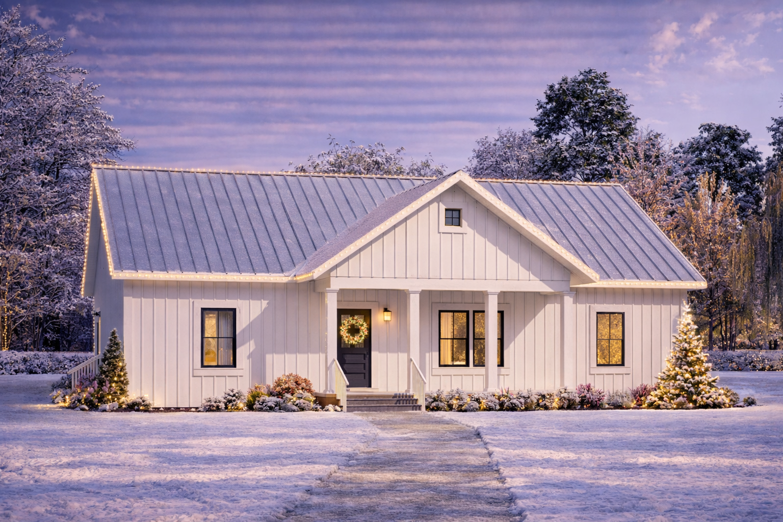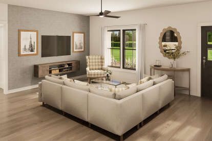 The exterior showcases classic modern farmhouse style with simple clean lines, balanced proportions, and a covered front porch that invites relaxed outdoor living. 1 Whether you imagine this home nestled on a quiet country lane or a cozy suburban street, the façade sets a warm tone with its welcoming presence. 2 A practical footprint ensures this design fits well on a variety of lot sizes without sacrificing street appeal. 3