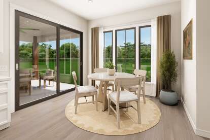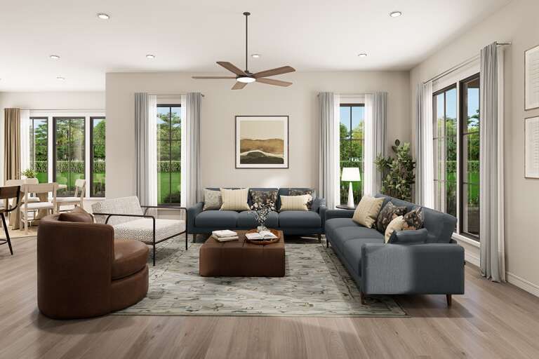 Inside, the home flows into an open main living area that unites the great room, dining space, and kitchen — creating a central hub for everyday life. 7 This open layout promotes connection between living zones while allowing individual spaces to maintain definition and purpose. 8 Large windows and vaulted ceiling elements help amplify light and volume, making the space feel both welcoming and expansive. 9