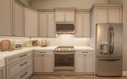 The kitchen features an efficient layout with ample counter space and cabinetry for everyday meal preparation and storage. A central island or peninsula provides extra work surface and casual seating, making it a natural gathering point for quick breakfasts or social conversation during dinner prep.