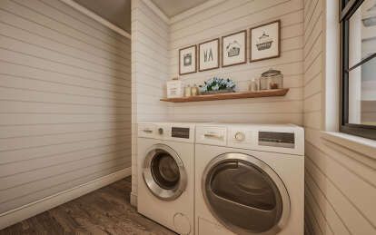 A dedicated laundry area keeps household tasks organized and out of sight from shared living spaces. Additional storage areas throughout the home help keep clutter contained, supporting a clean and efficient interior environment.