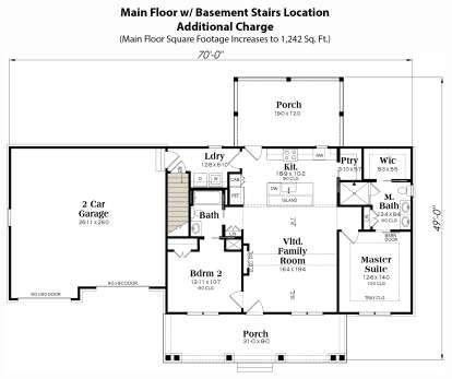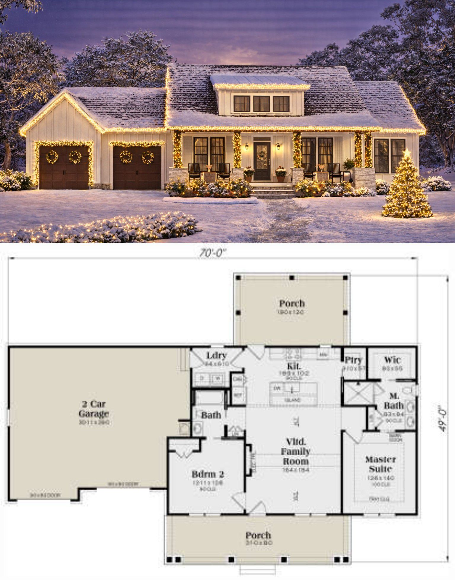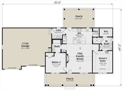 The exterior blends classic farmhouse simplicity with modern sensibilities. Clean lines, traditional siding, and well-proportioned gables give the home a timeless look, while the sizable covered front and rear porches (over 476 sq ft total) create strong outdoor presence and charm. 1 Measuring about 70′ wide × 49′ deep, the design makes a big impression on modest lots and provides a welcoming entrance for residents and guests alike. 2