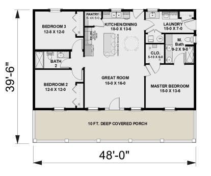 The exterior presents timeless modern farmhouse characteristics — clean lines, balanced proportions, and generous windows that give the home a warm, approachable presence. 1 A covered front porch stretches across much of the facade, offering a relaxed outdoor living space ideal for rocking chairs, casual conversations, or greeting guests. 2 With a footprint roughly 48′ wide × 39′ 6″ deep, it fits neatly on many lot sizes while still making a strong visual statement. 3