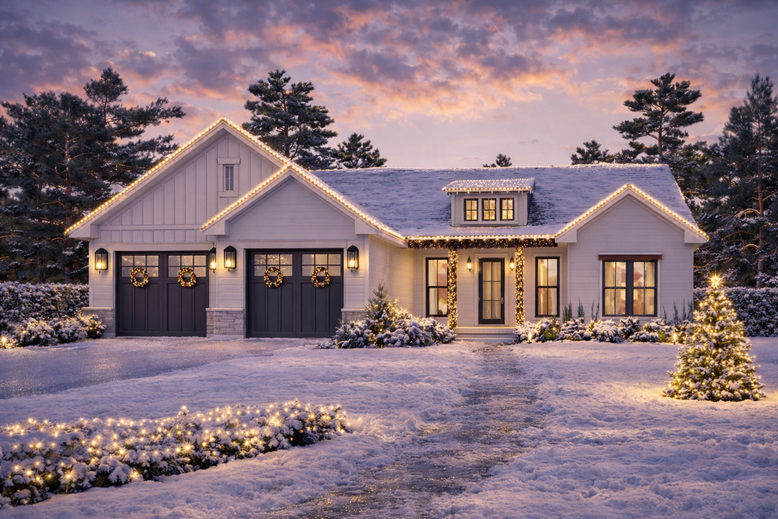 A dedicated laundry space and practical transitions from the garage to the interior help keep daily life organized. 20 The garage entry into a mudroom-style zone ensures that outdoor gear and everyday essentials stay neatly contained before entering the main living areas. 21 Gutters and rooflines are positioned to support efficient drainage while adding architectural interest. 22