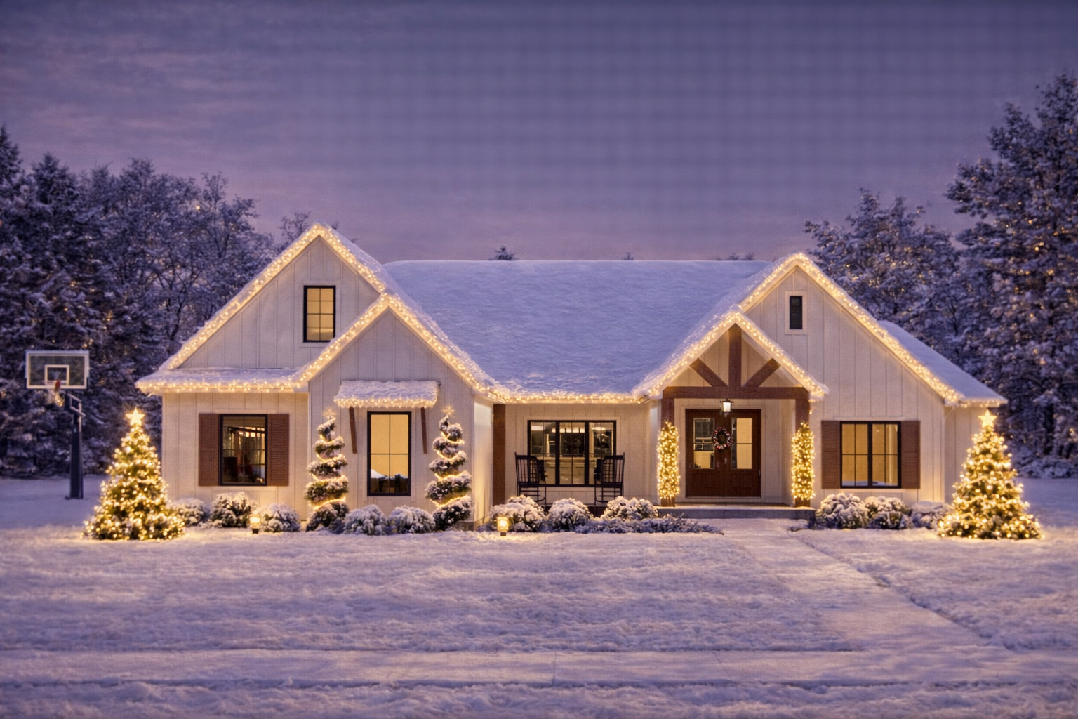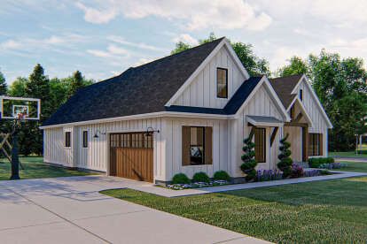 The exterior showcases timeless modern farmhouse aesthetics with simple rooflines, balanced proportions, and a welcoming covered front porch. 1 Measuring roughly 66′ wide × 62′ deep, the façade offers pleasing symmetry and a strong presence on a variety of lot sizes. 2 Classic board-and-batten accents and a side-entry garage add to the home’s refined but approachable character. 3