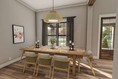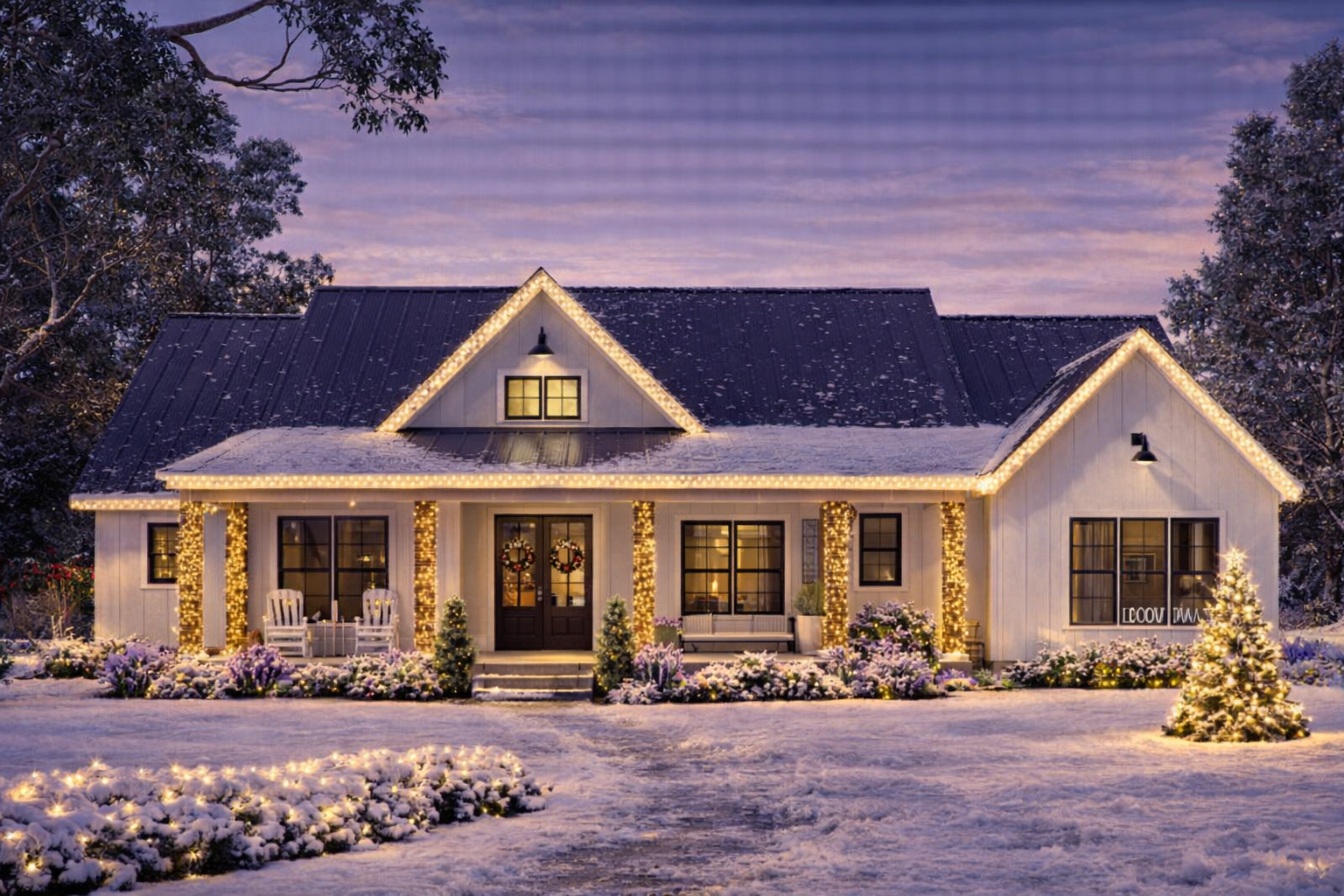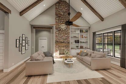 The exterior captures quintessential farmhouse charm with a wide covered front porch extending nearly the full width of the home — a perfect spot for rocking chairs, morning coffee, and greeting neighbors. 1 Warm wooden beams, large windows, and a balanced gable roof provide striking curb appeal and a welcoming presence. 2 With a footprint around 74′ wide × 73′ deep, this design sits well on a spacious lot while maintaining proportion and charm. 3